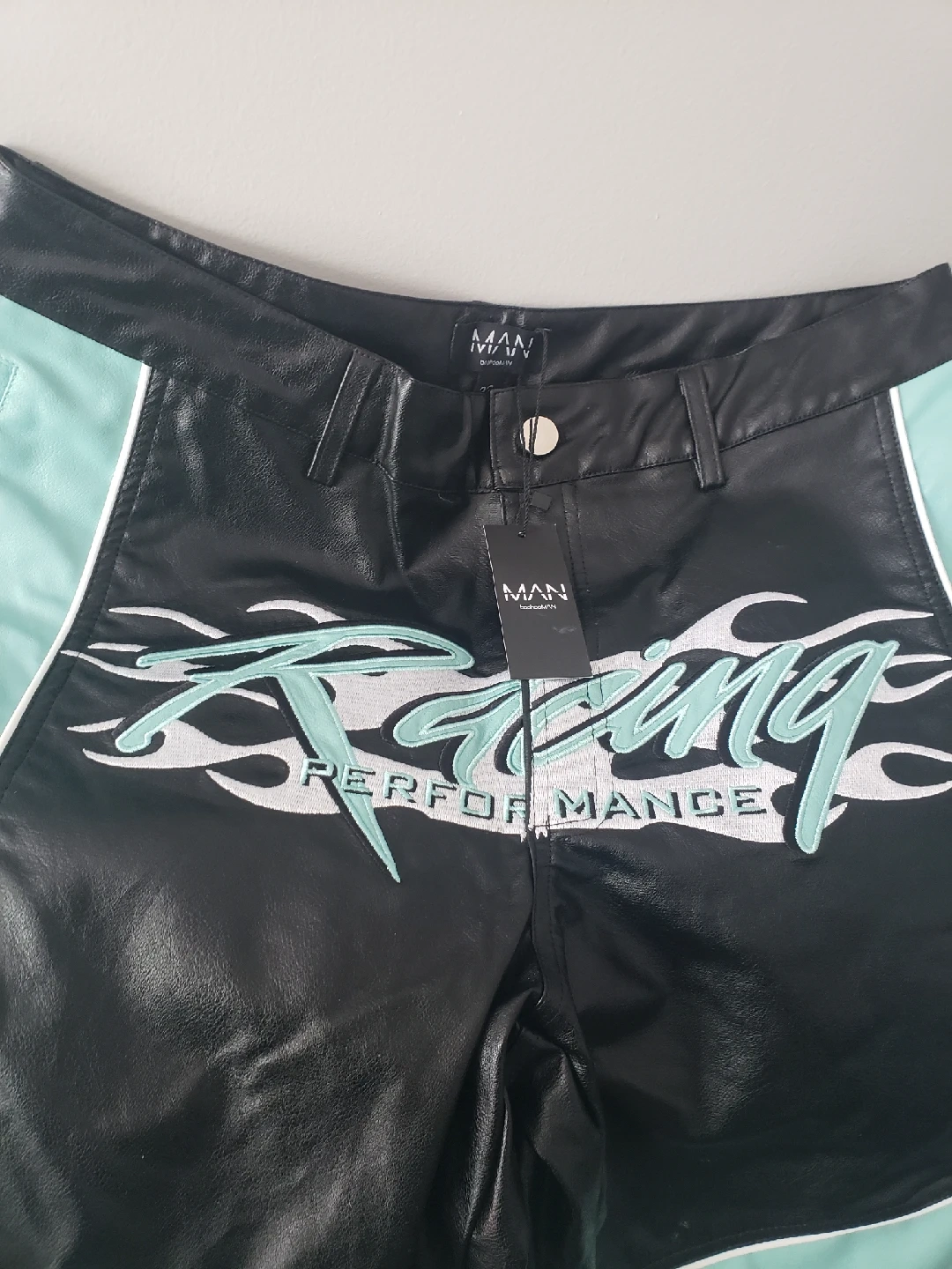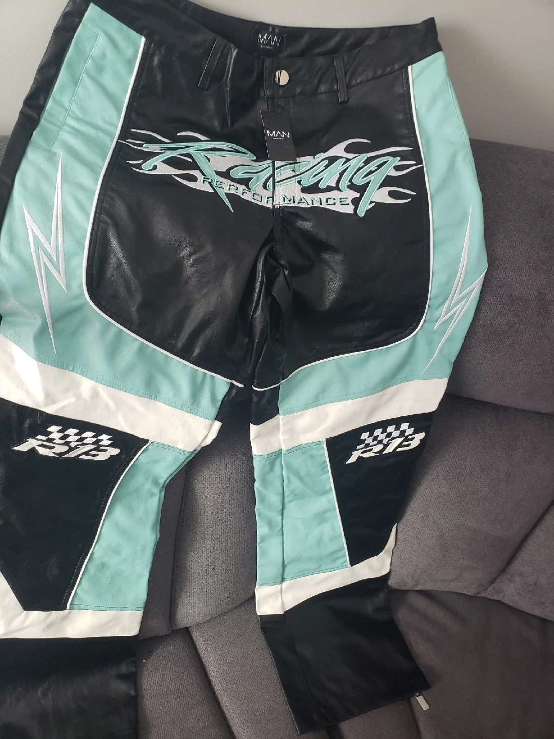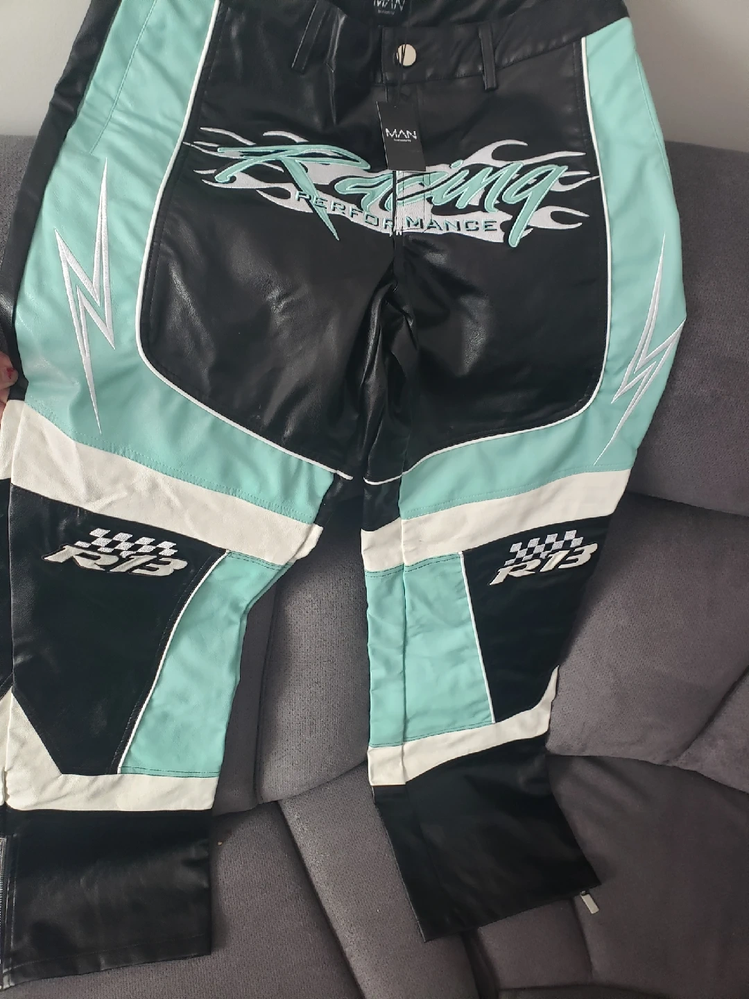 15These BoohooMAN racing performance pants are in excellent condition! They feature a unique racing design with black, white, and light blue accents. Perfect for adding a sporty edge to your wardrobe