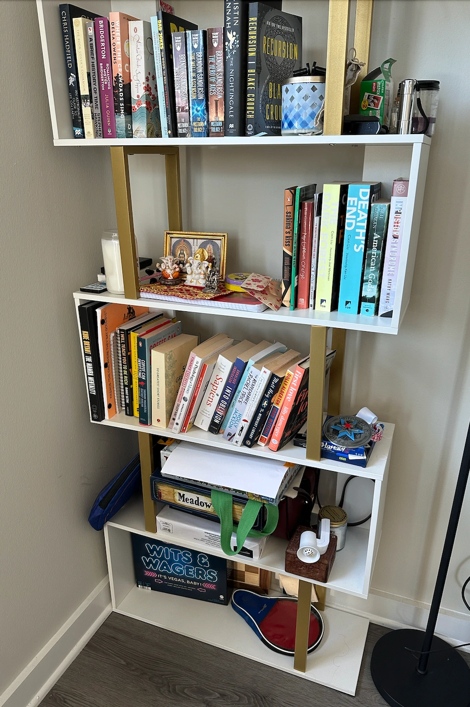 76Gadroad 5 Tier Geometric Bookcase,S Shaped Bookshelf, Wood Decorative Storage Shelving, Modern Freestanding Display Shelves, Tall Book Shelf Unit for Living Room Bedroom, Gold Note: Books not included. https://a.co/d/2SnSarF