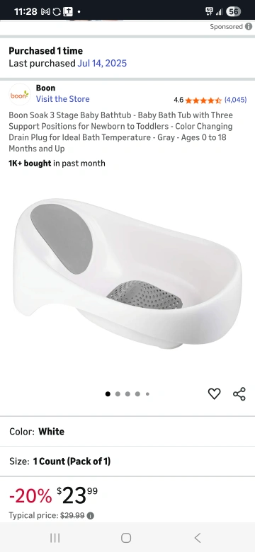 Selling a Boon Soak 3 Stage Baby Bathtub in white! It's a baby bath tub with three support positions for newborns to toddlers. It also has a color changing drain plug for ideal bath temperature. Perfect for ages 0 to 18 months and up! I've used it only one time because I got another bath tub as a gift.