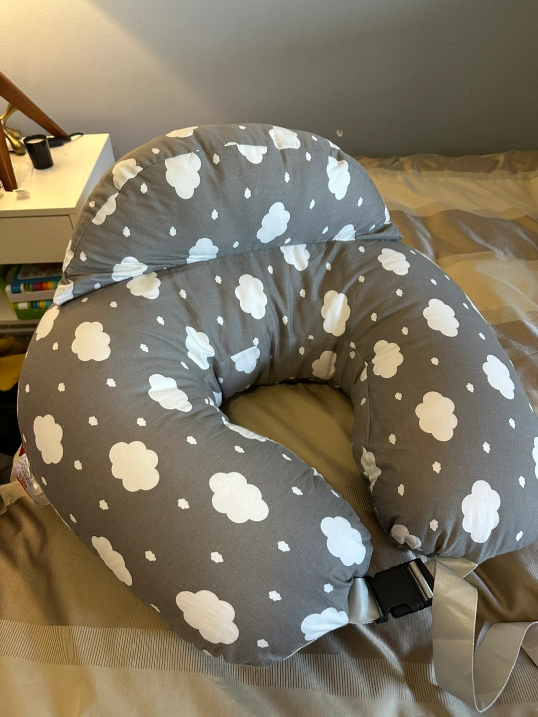 60Selling a Boppy nursing pillow in a cute gray color with a white cloud pattern! It's in great condition and has a strap to help keep the pillow in place while nursing or bottle feeding your baby. Perfect for supporting your little one during feeding time