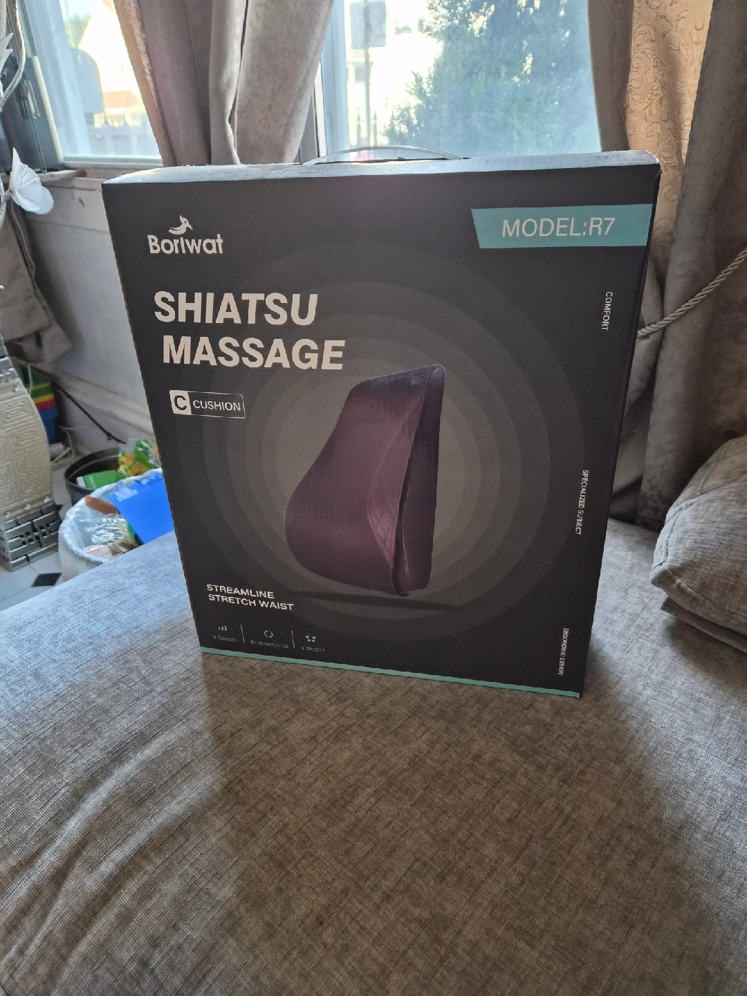 Selling a new Boriwat Shiatsu Massage Cushion, model R7! It has a streamline stretch waist design. It's designed for comfort and specialized subject ergonomic design. It features 3 speeds, bi-directional massage, and 4 nodes. Will make a great Christmas present for someone.