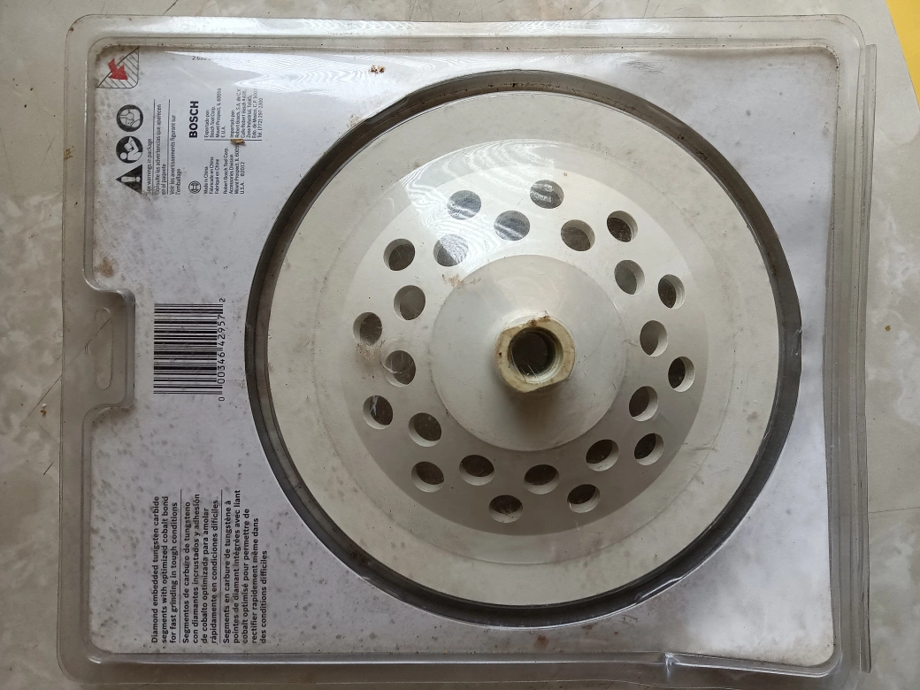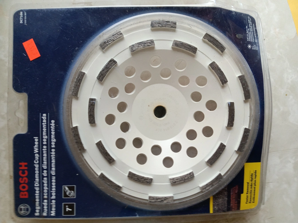 Selling a Bosch 7" segmented diamond cup wheel. It's designed for faster material removal and has optimized cobalt bond segments for optimal adhesion. Great for grinding and smoothing concrete or stone surfaces