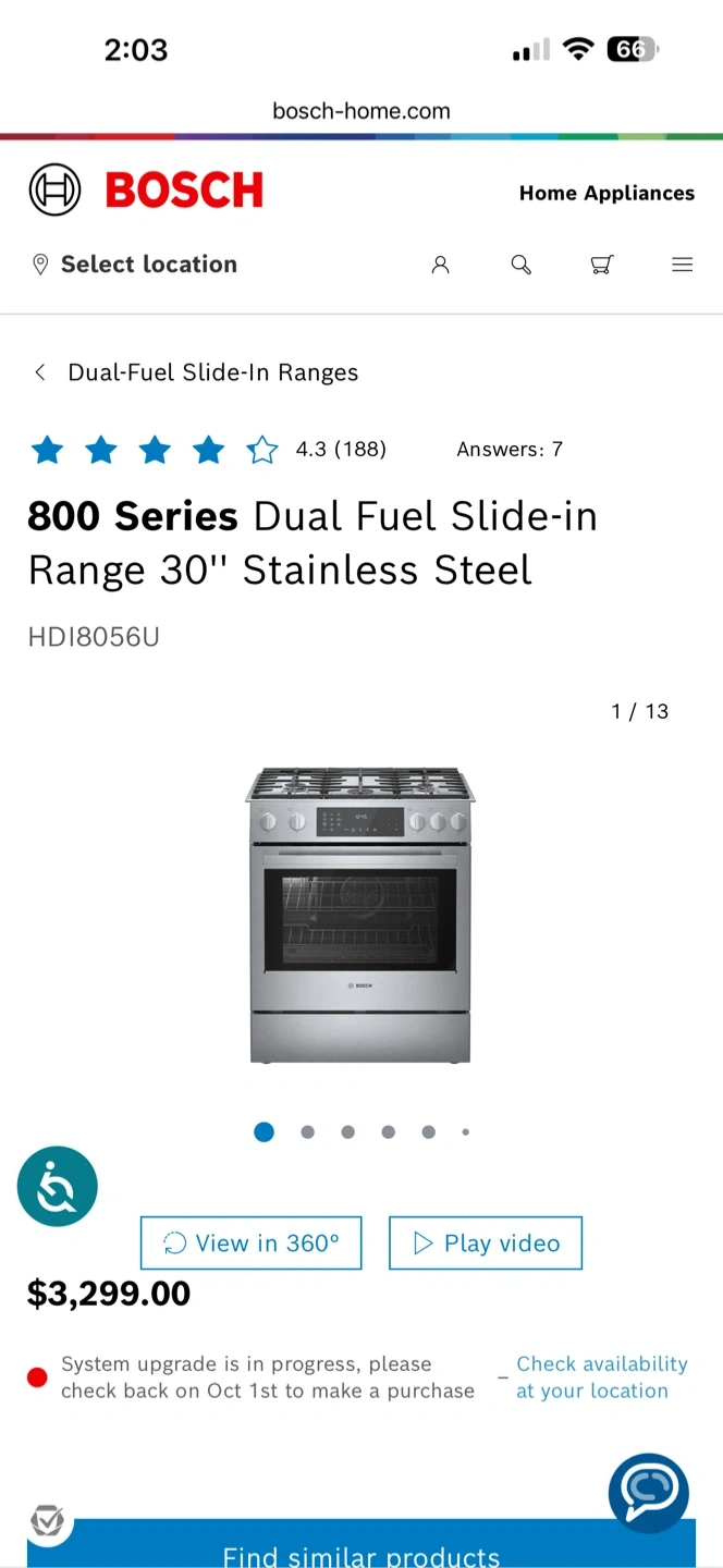 For Sale: Bosch 800 Series Dual Fuel Slide-In Range (Stainless Steel) Top-of-the-line Bosch 800 Series 30 in. Dual Fuel Range in excellent condition. Only 1 year of use and working perfectly. (New units retail for $3,299!) Key Features: • Dual Fuel: Combines a powerful 5-burner Gas Cooktop with a precise 4.6 cu. ft. Electric Convection Oven for optimal cooking. • Convection & Cleaning: Features Self-Cleaning Convection for even baking and easy maintenance. • Premium Look: Professional slide-in design with a durable stainless steel finish. Important Notes: • The oven is fully functional, but requires running its self-cleaning cycle before use. • Moving Warning: This range weighs 227 lbs. A minimum of 3 people are required for safe pickup/loading. Accepting Offers! Don't miss out on this high-end appliance.