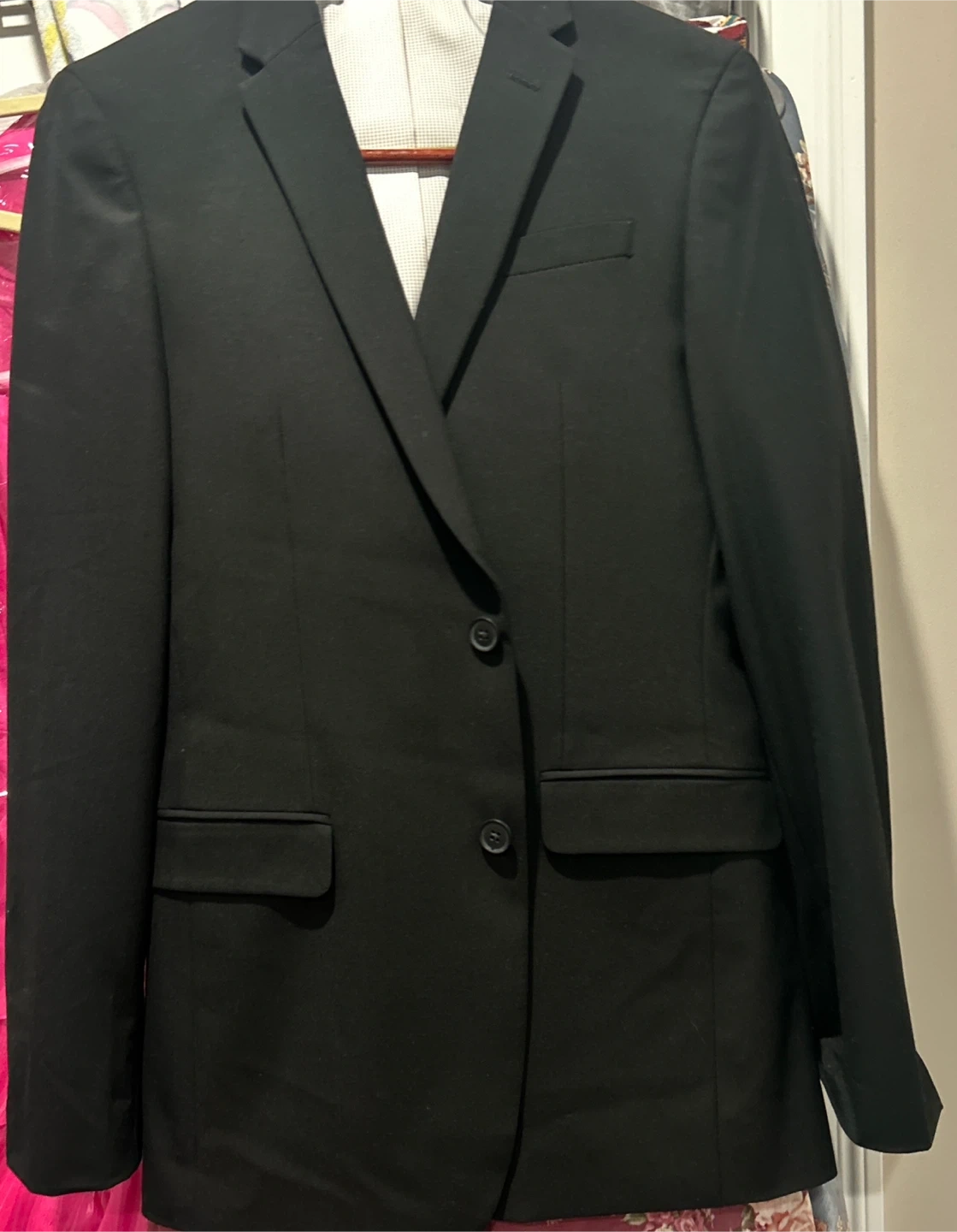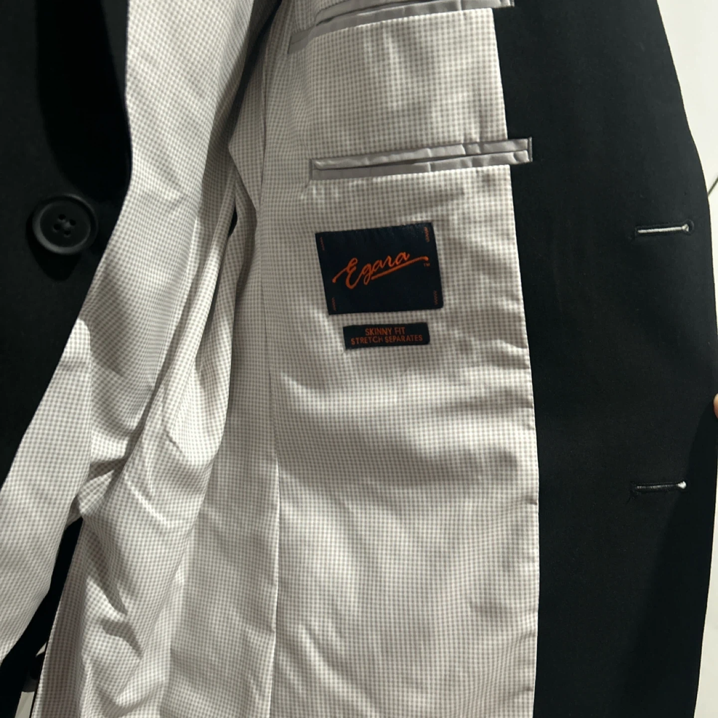 10Here's a stylish black Egara blazer for men! It's in great condition and ready to wear. This blazer is perfect for dressing up or down, making it a versatile addition to your wardrobe. It has a classic look and feel!