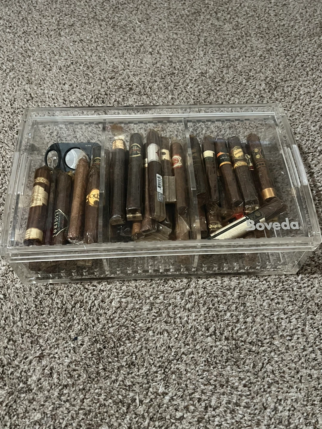 Boveda humidor in oustanding condition. Includes a variety of 36 cigars, a cutter, and a Thompson travel case. This is the large Boveda humidor and holds up to 65 robusto cigars. The travel case holds about a dozen and includes a humidity guage. Must be 21 years or older to purchase.