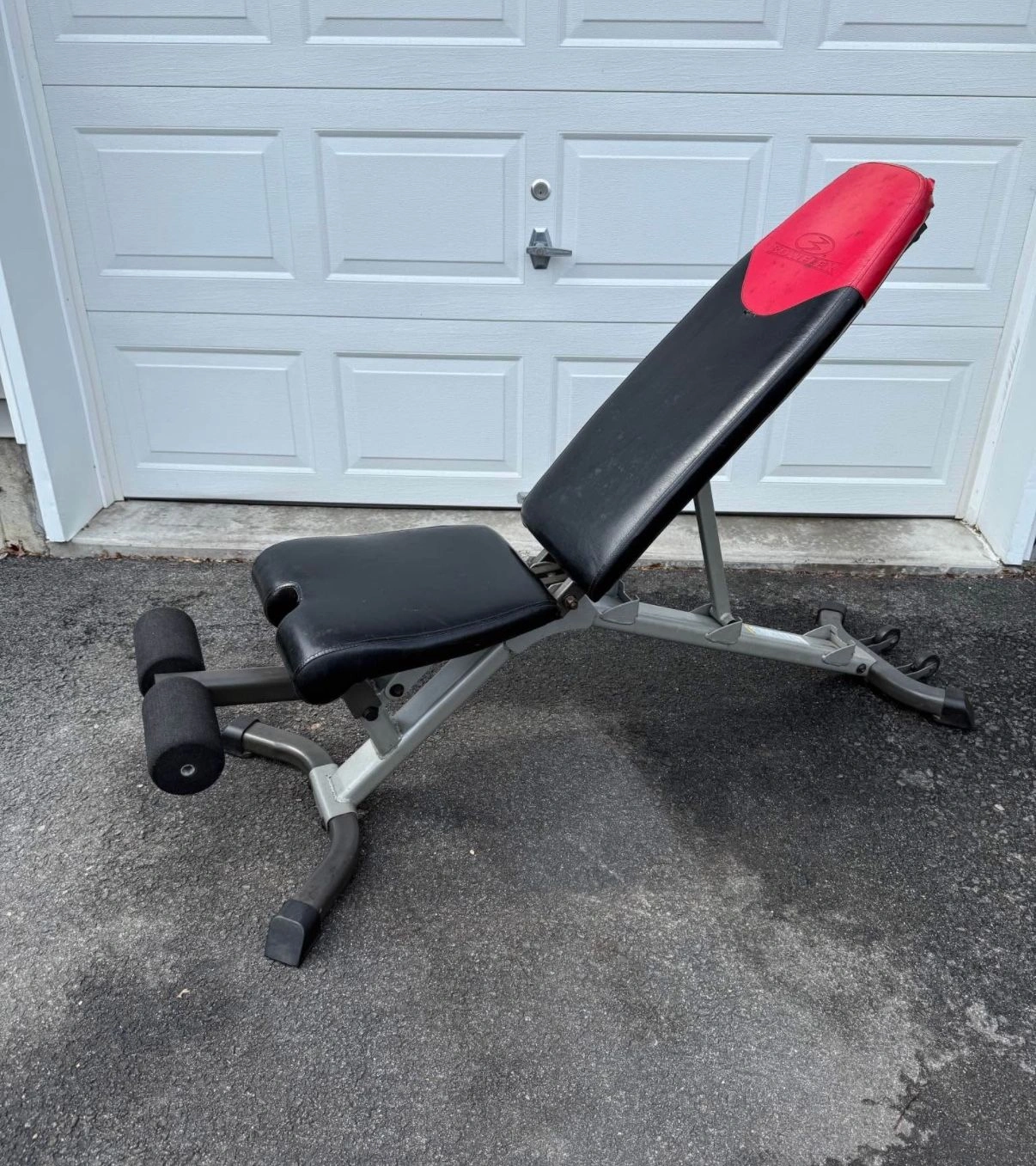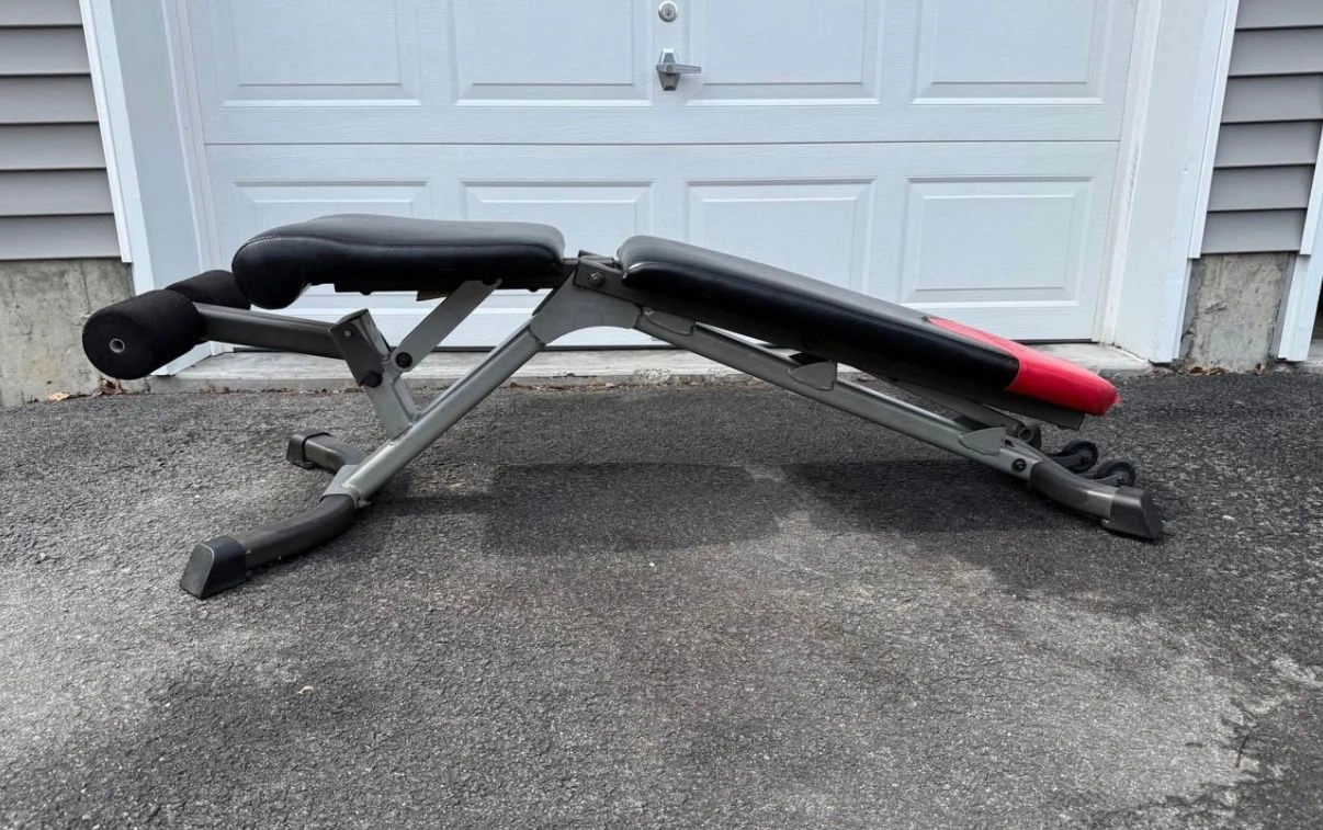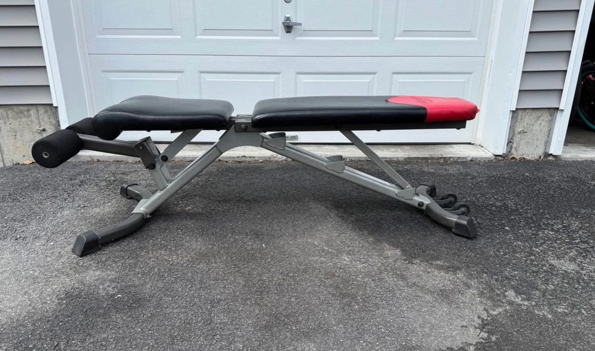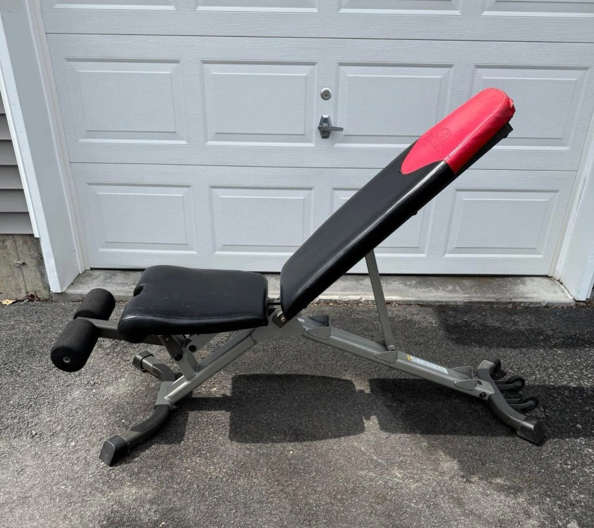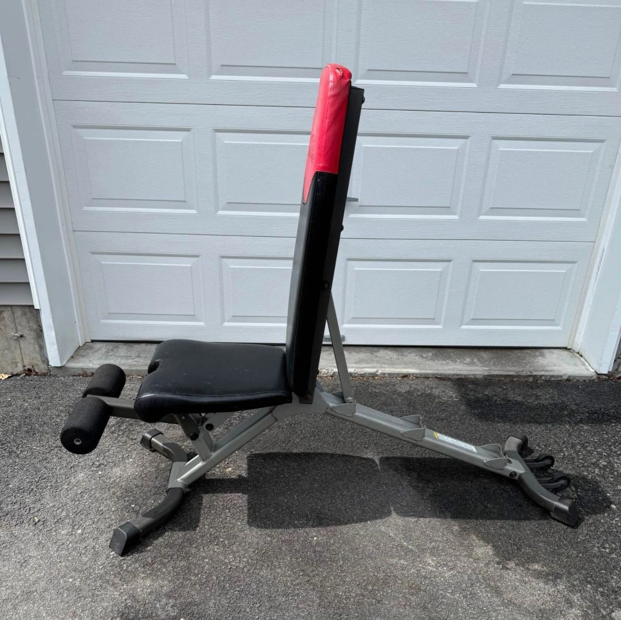 15Bowflex adjustable weight bench. Pads are in good condition. A few imperfections but does not affect the functionality or feel of the bench. This bench is solid and stable and comes with wheels for easy mobility Back pad has 4 different adjustments: Flat, incline, decline, seated. Stations: Bench press Brand: Bowflex