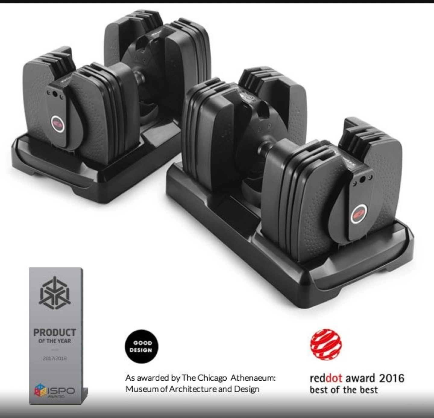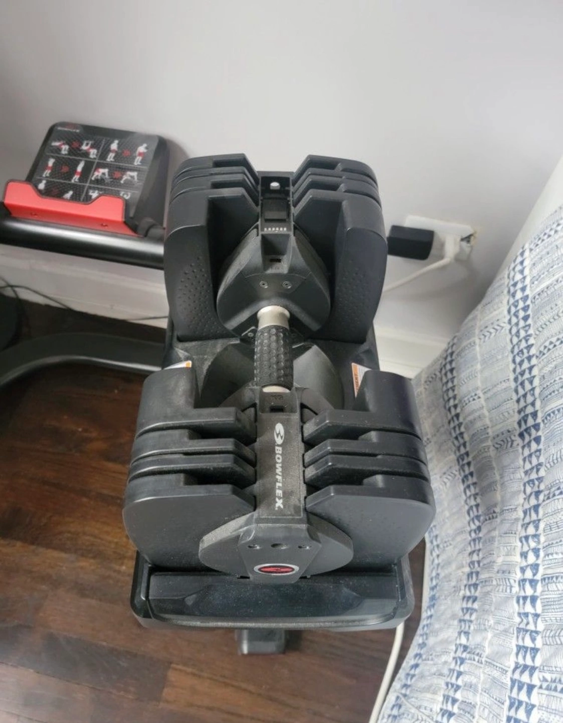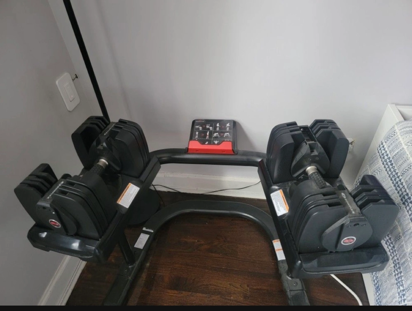 Adjustable dumbbells, black, comes with stand. Great for home workouts.