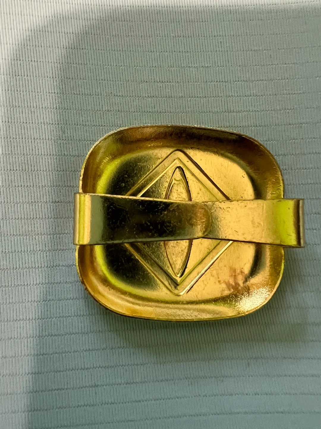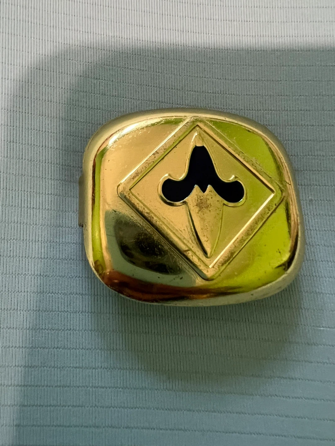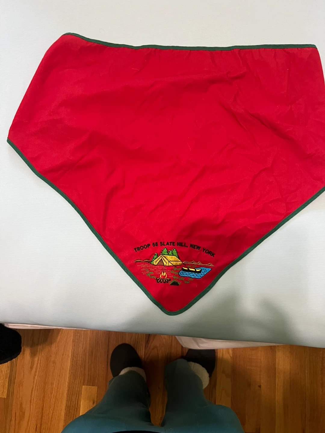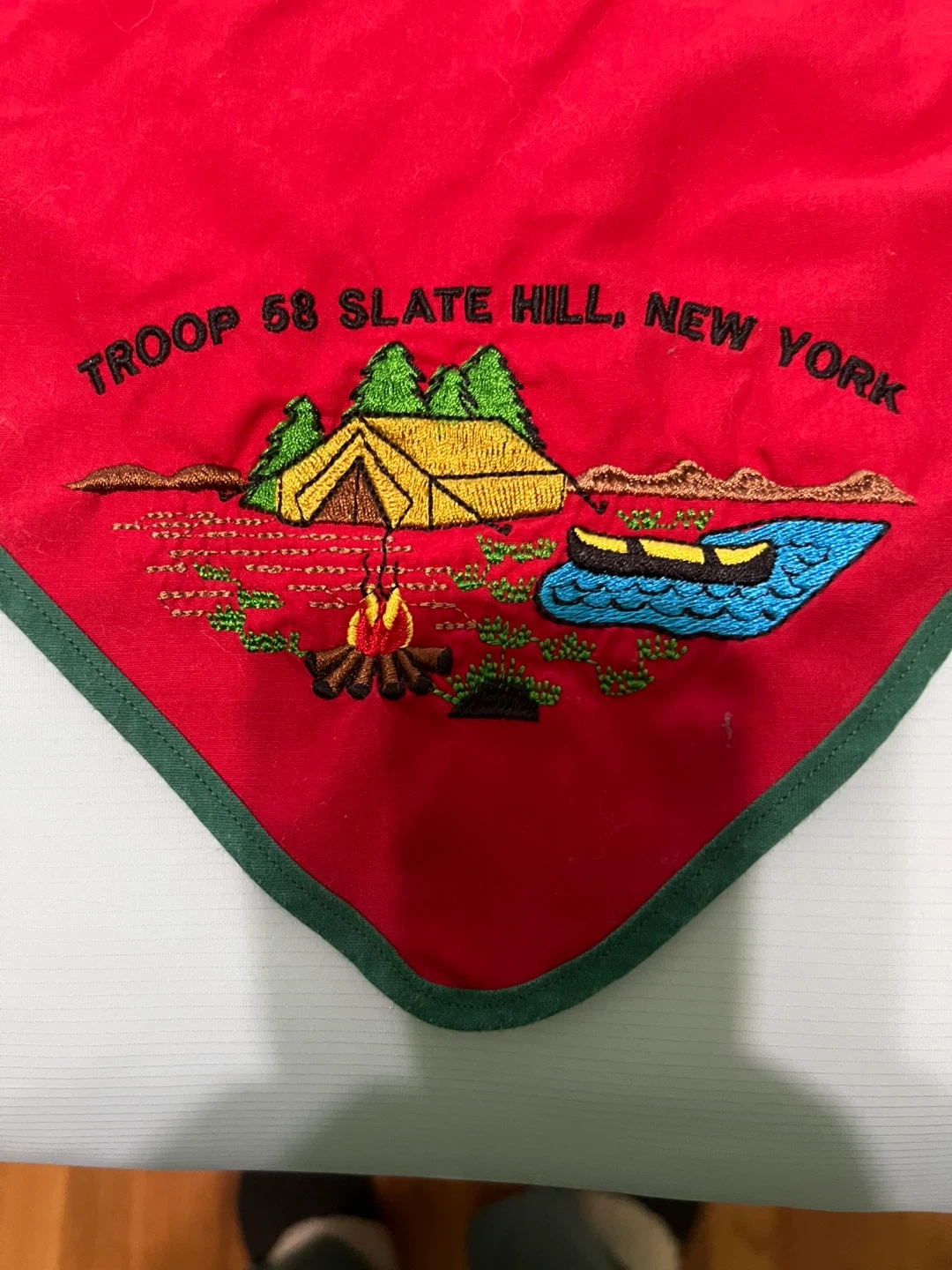 65Selling a Boy Scout neckerchief from Troop 68 Slate Hill, New York, along with its slide. The neckerchief is red with a green border, and features an embroidered design with a tent, campfire, and canoe. The slide is gold-colored with a diamond-shaped design