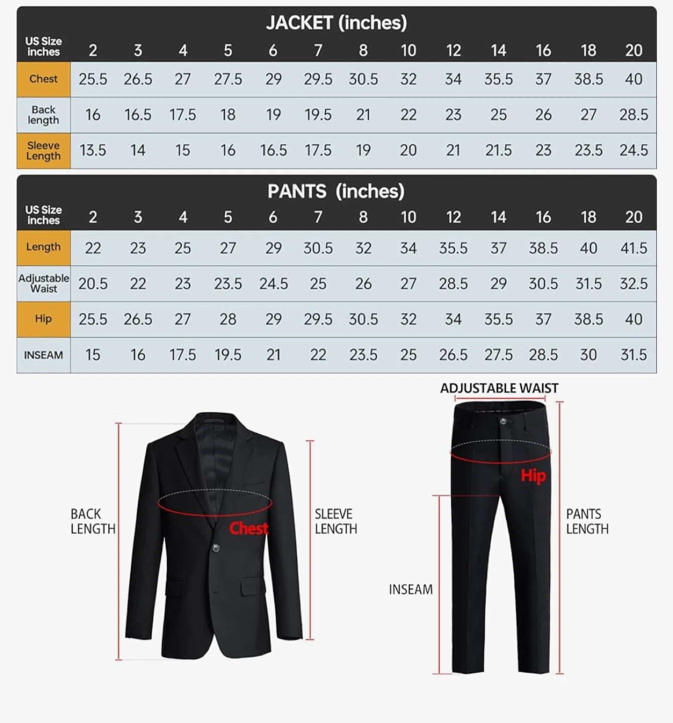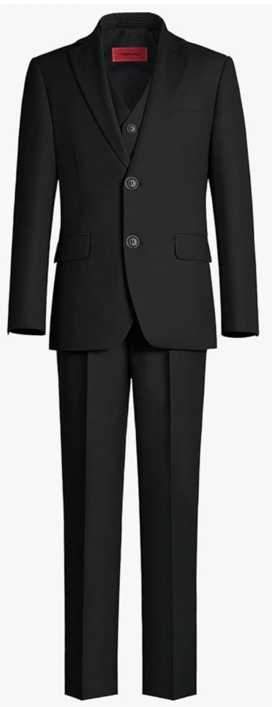 This is a stylish 4-piece black suit for boys, including a jacket, vest, and pants and tie.The pants feature an adjustable waist for a comfortable fit. Perfect for special occasions! Worn once!