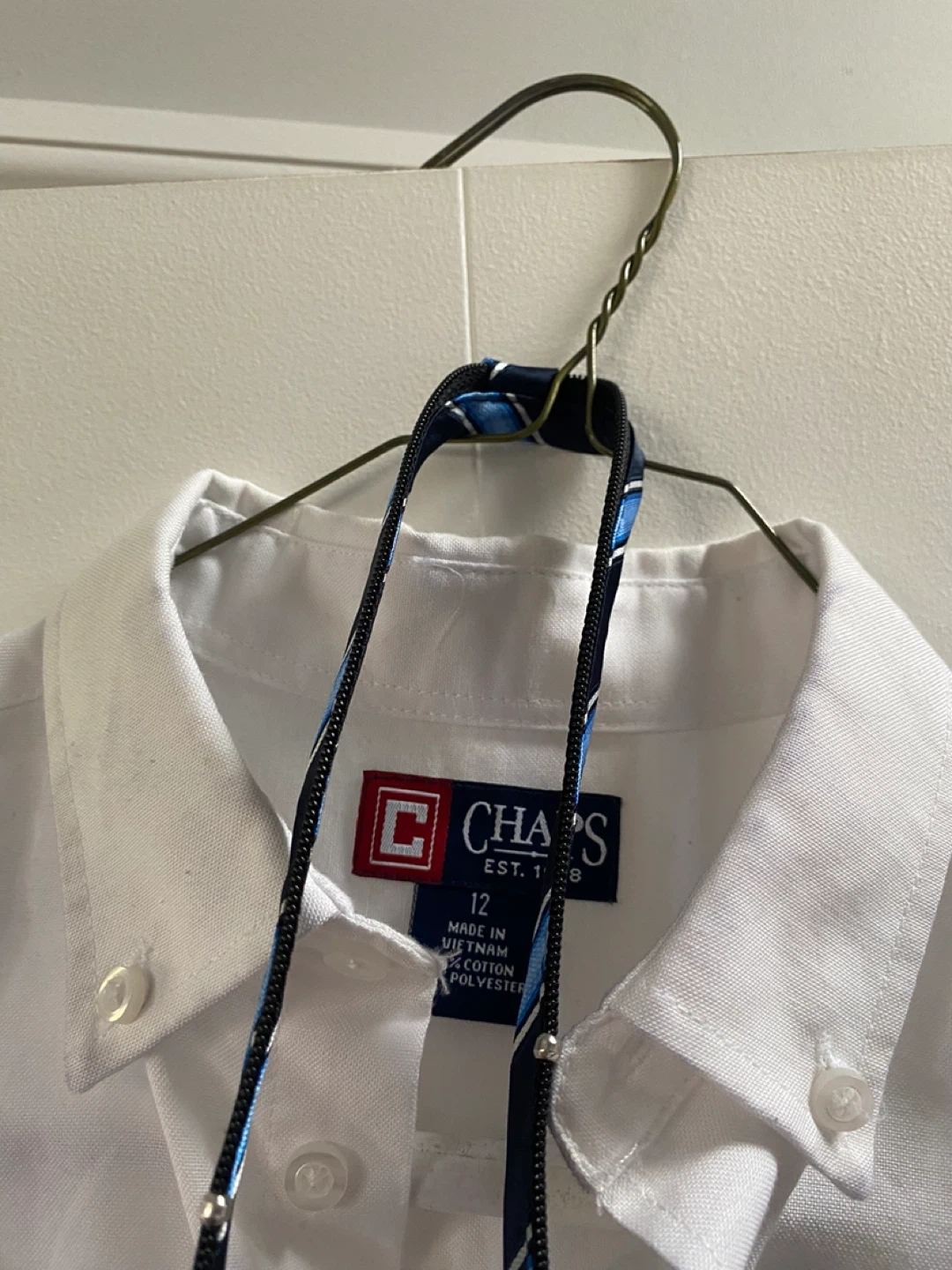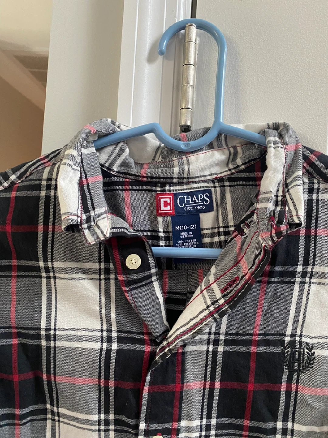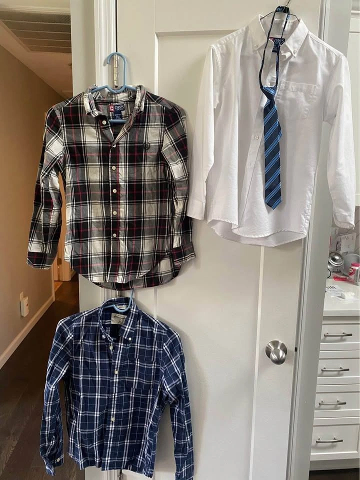 0Boy's Button Down Shirts long-sleeved LOT includes: CHAPS Size M (10/12) Black/Red/White Plaid lightweight flannel Shirt Abercrombie Kids XL Blue Plaid Cotton Shirt CHAPS Size 12 White Cotton Shirt with Dockers zipper adjustable blue striped tie Cash Only. Will meet up locally.