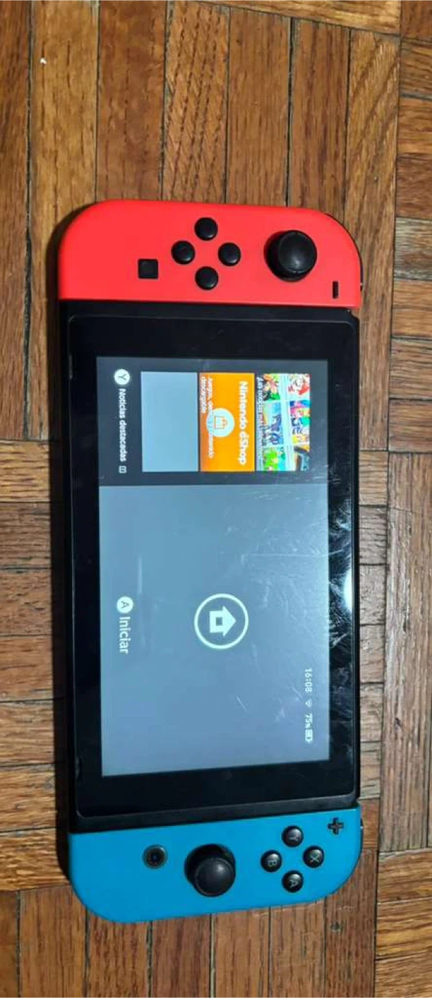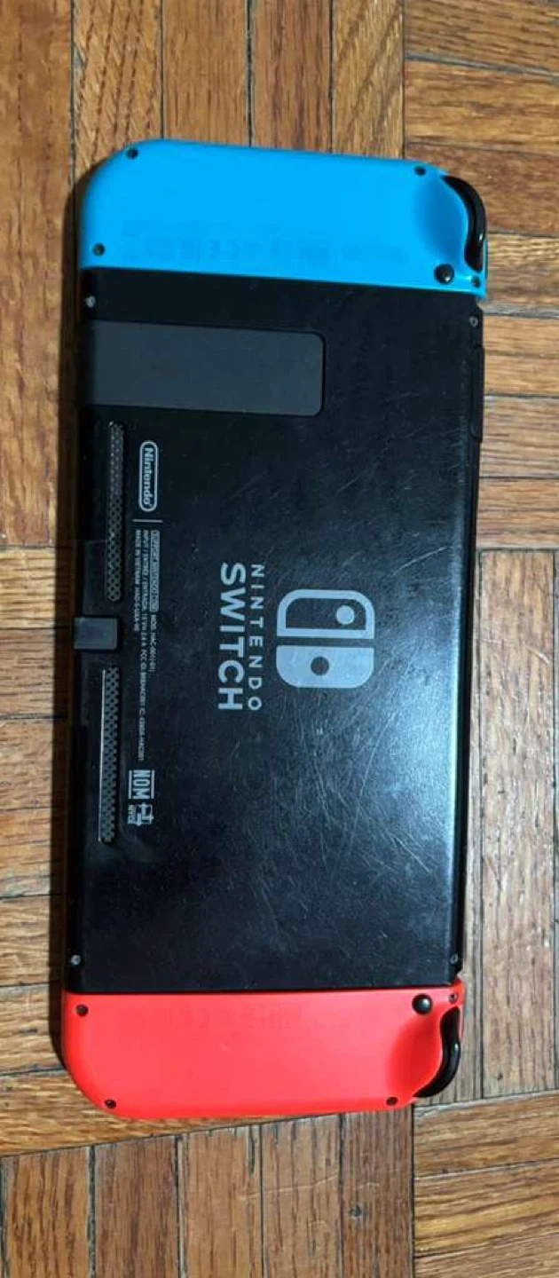 Nintendo Switch console with red and blue Joy-Cons. Includes the dock, AC adapter, and Joy-Con grip. All necessary components for gaming are present. It's a versatile console for home and on-the-go play!