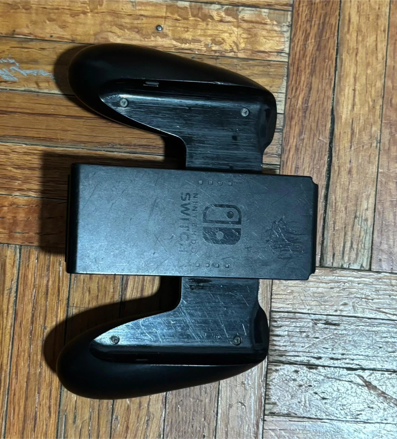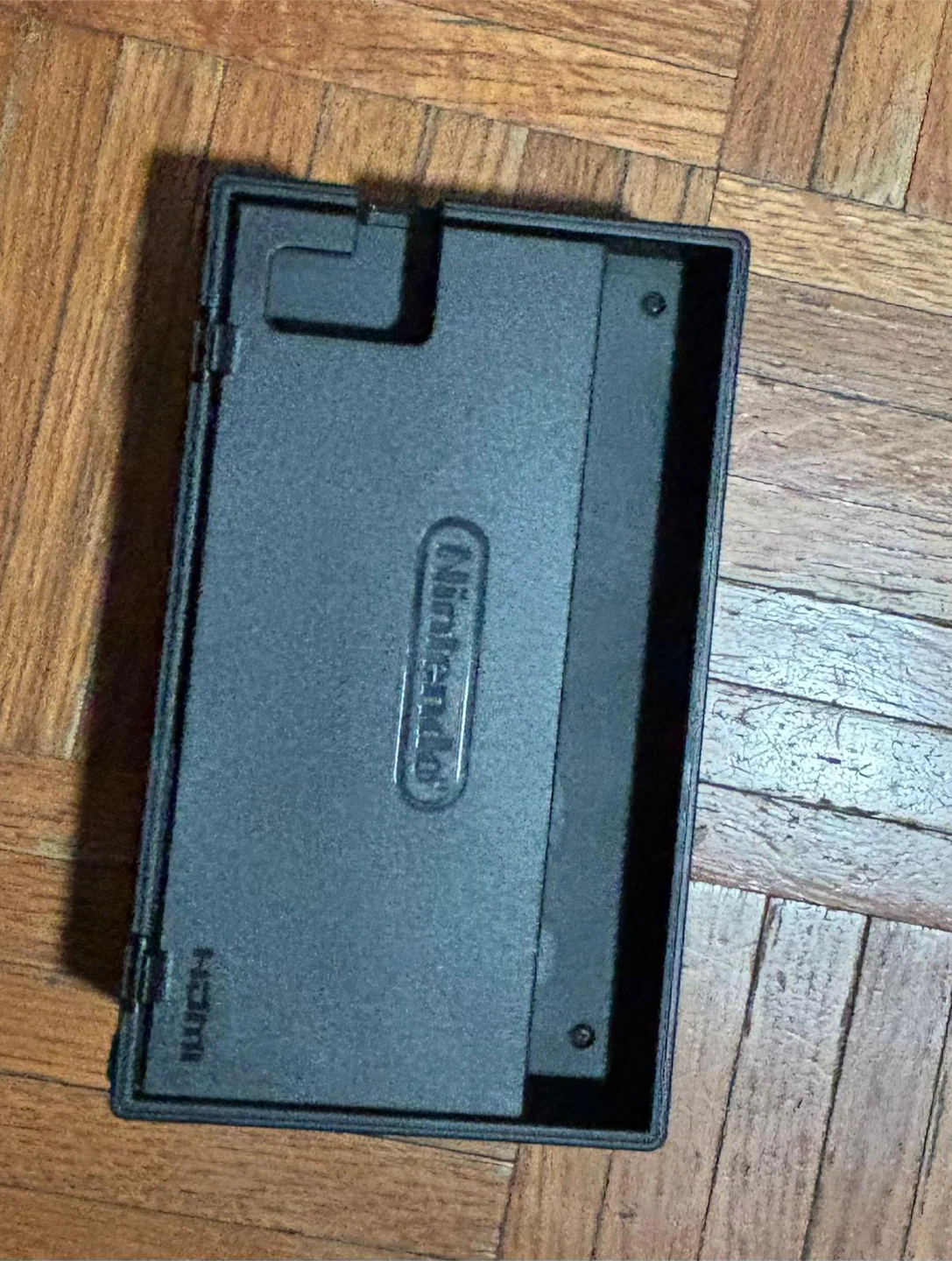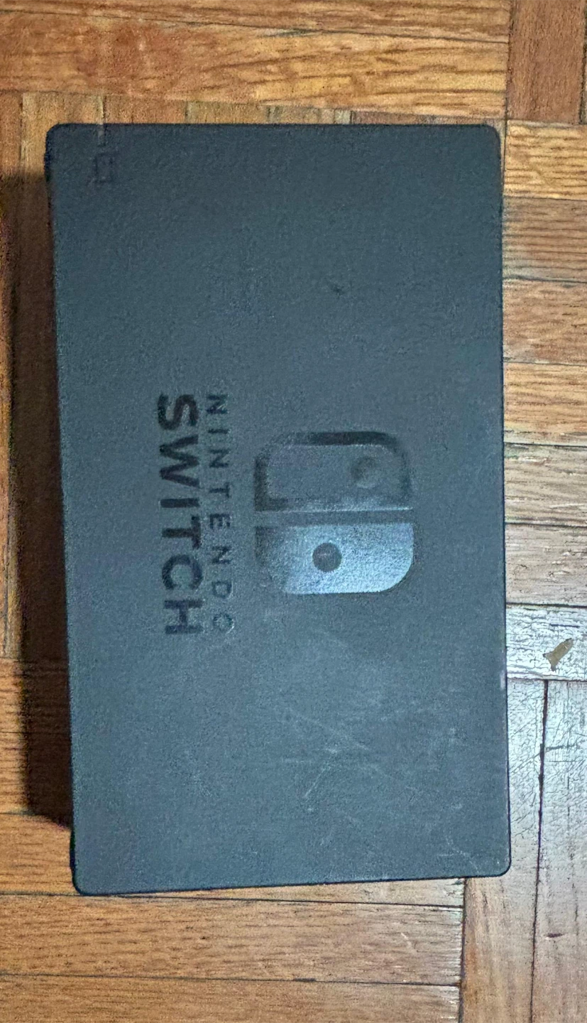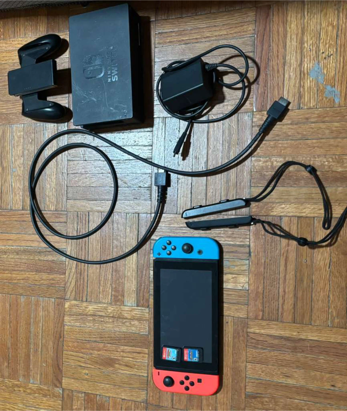 Nintendo Switch console with red and blue Joy-Cons. Includes the dock, AC adapter, and Joy-Con grip. All necessary components for gaming are present. It's a versatile console for home and on-the-go play!