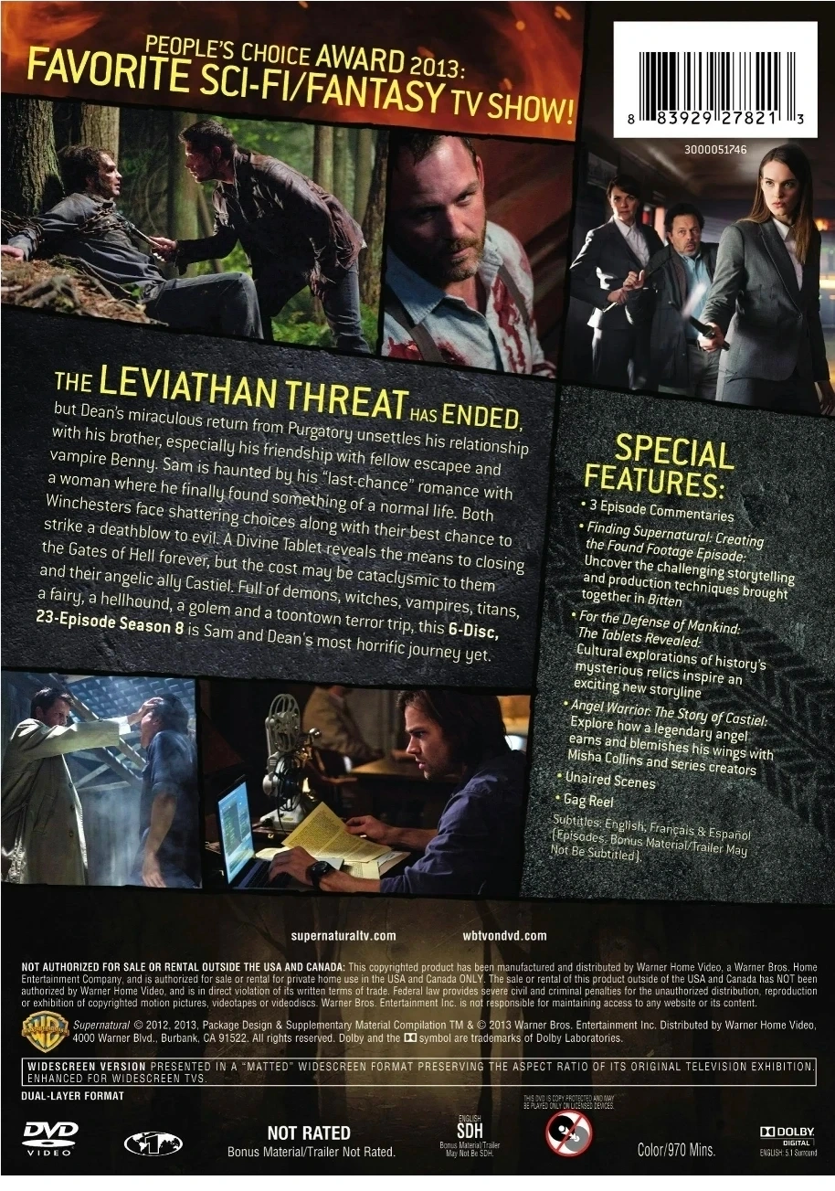 🥕 Selling Supernatural: The Complete Eighth Season on DVD! It is a 6-disc set. This season won the People's Choice Award in 2013 for Favorite Sci-Fi/Fantasy TV Show! The DVD also includes special features like commentary and gag reels. Make offer. disc condition is like new. Never been played and no scratches