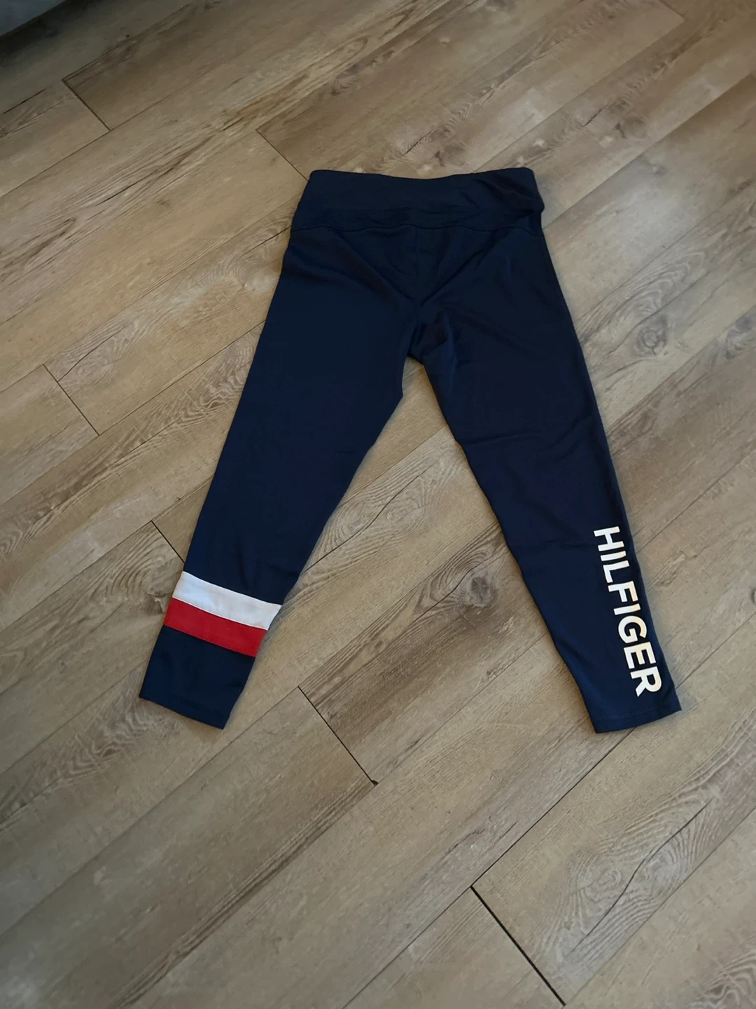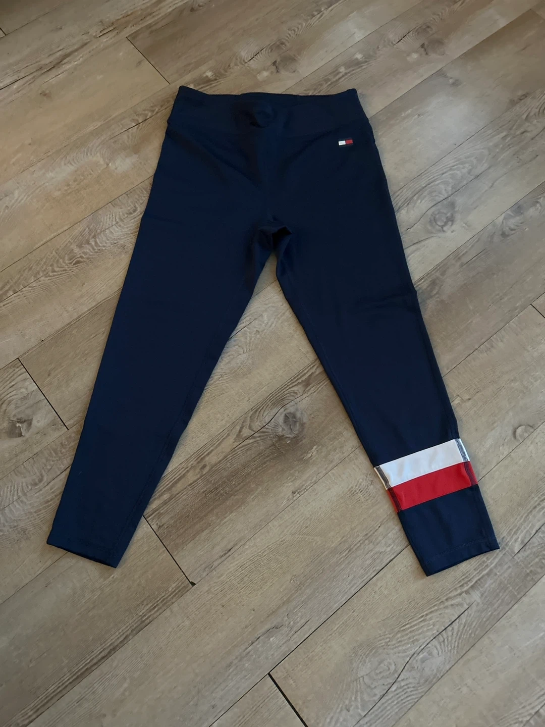Tommy Hilfiger navy blue leggings. Features a signature color block stripe detail on the lower leg and brand logo text. Comfortable and stylish for everyday wear.