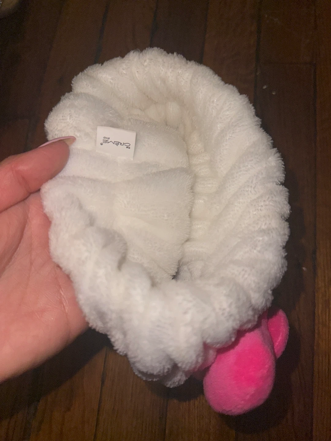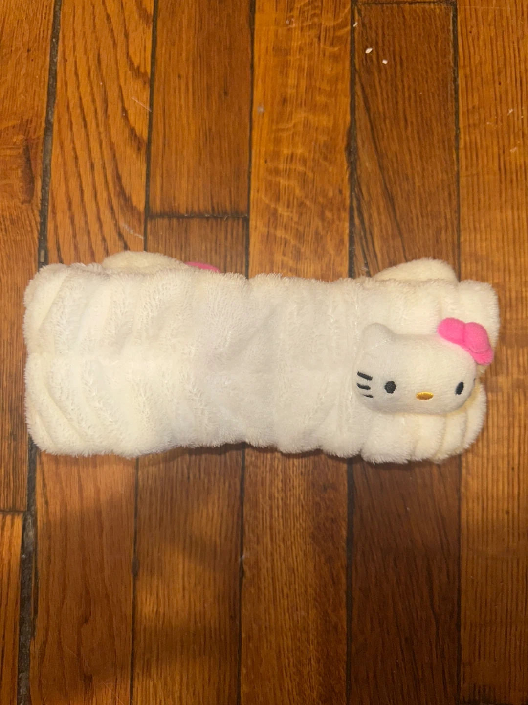 This plush headband features a cute Hello Kitty design with a pink bow. It's made from soft, white material perfect for keeping hair away during skincare routines. The elastic band ensures a comfortable fit for most head sizes.