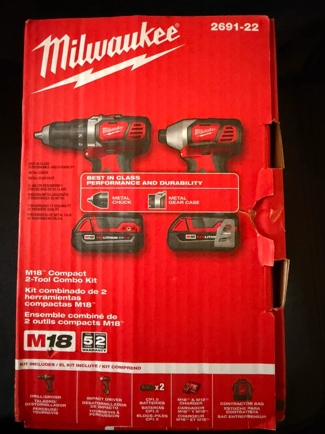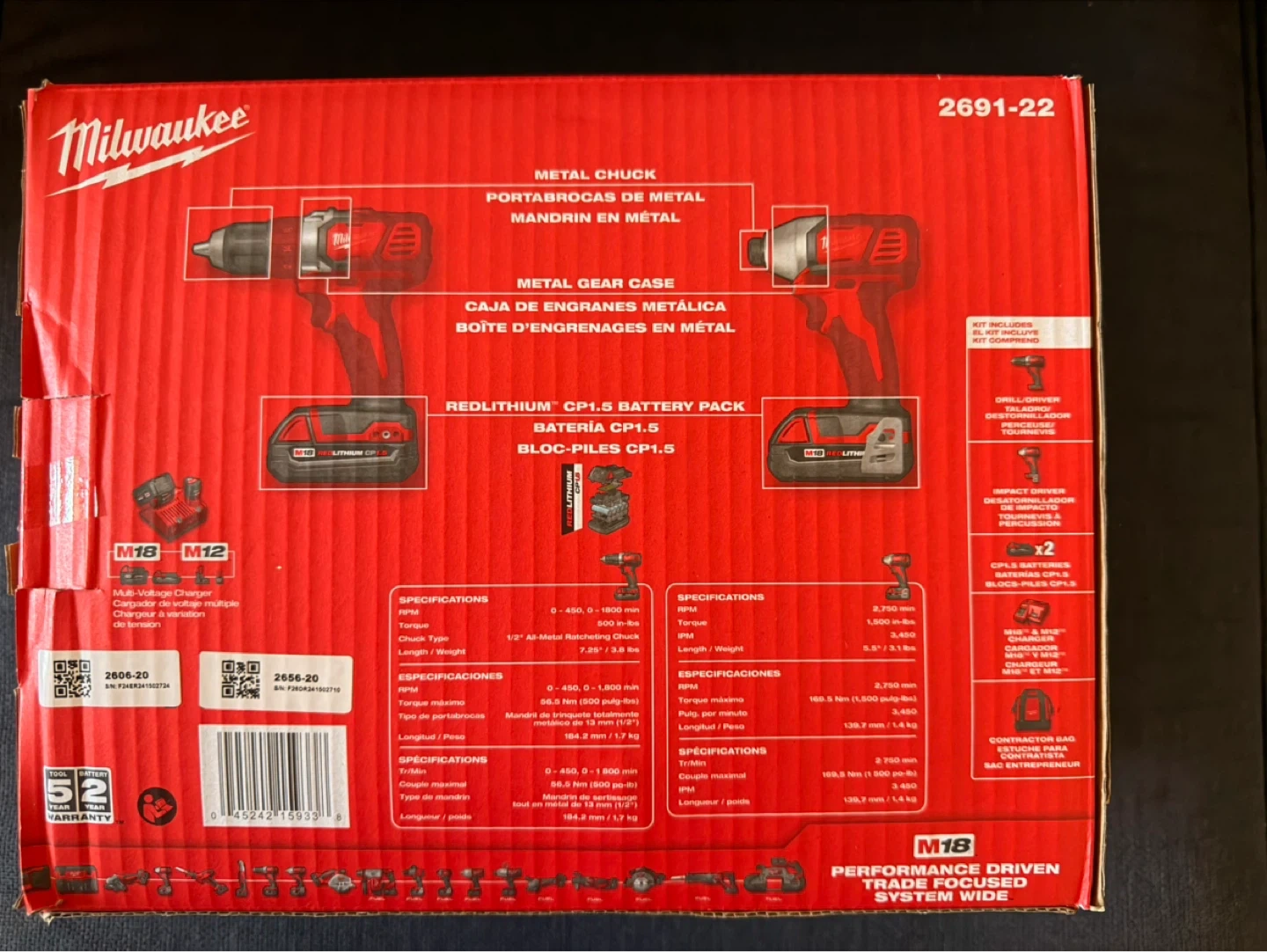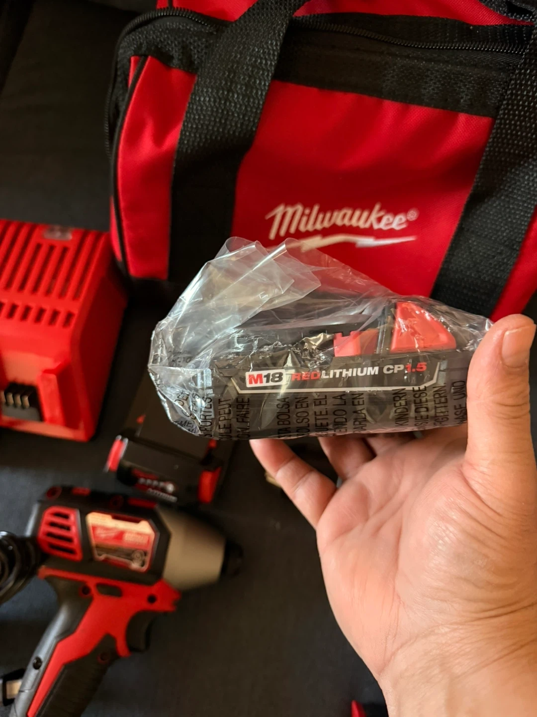 Includes M18 REDLITHIUM CP1.5 battery and M12/M18 charger. This 2-tool combo kit features a drill and an impact driver. Comes with a red Milwaukee carrying bag.