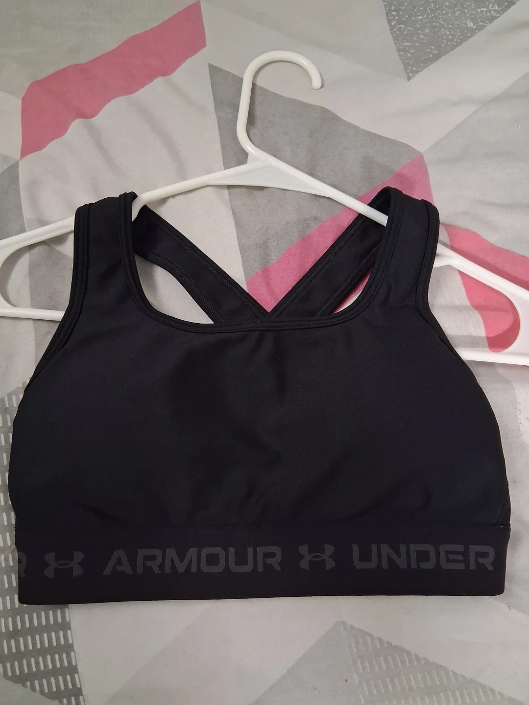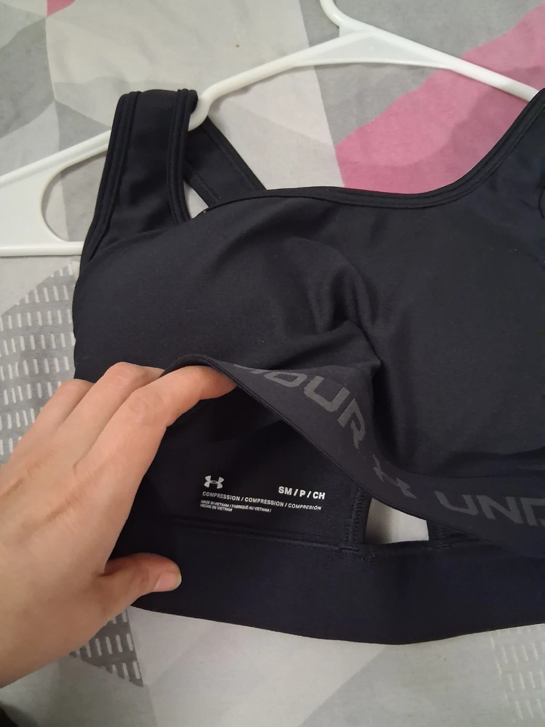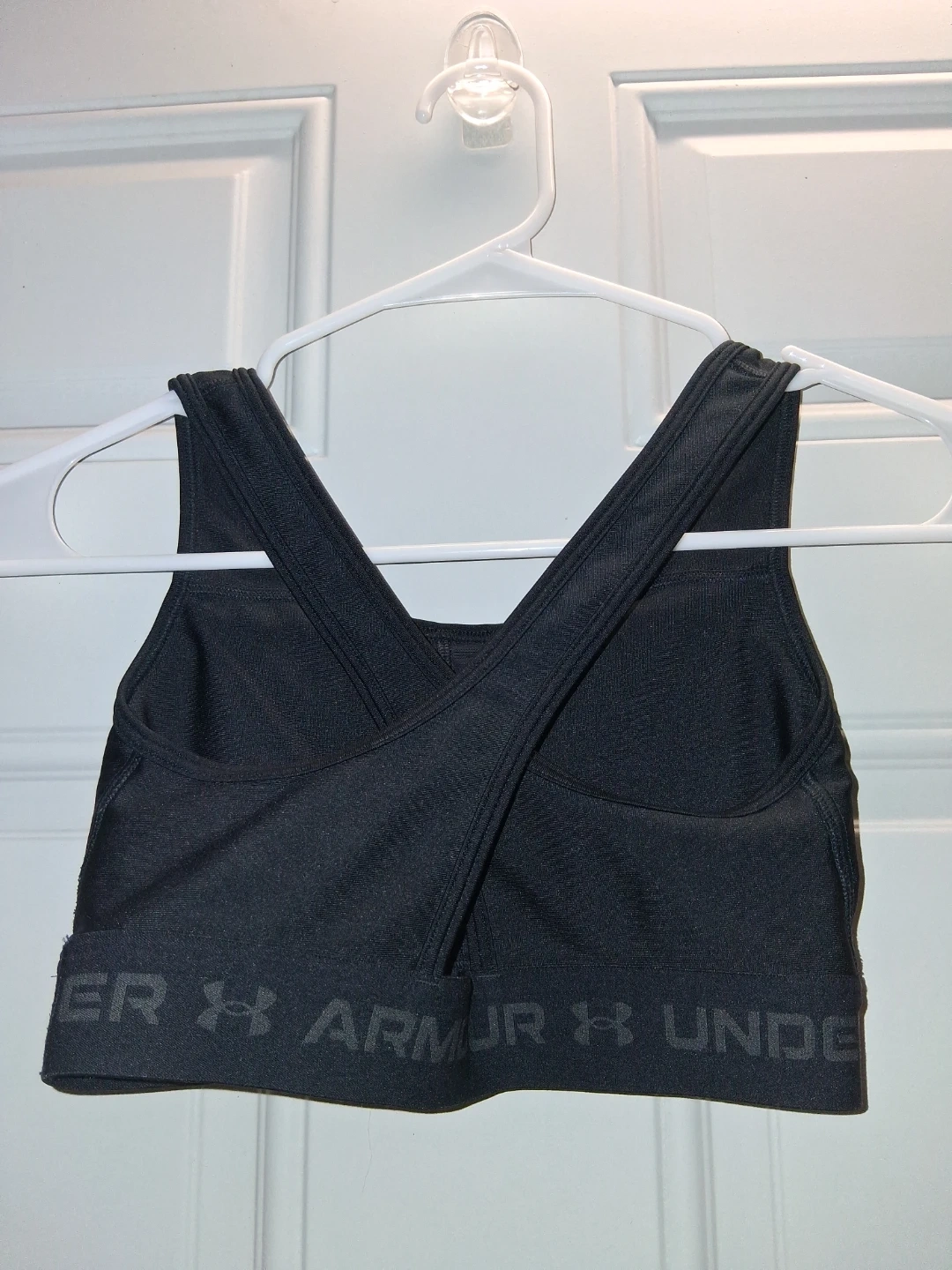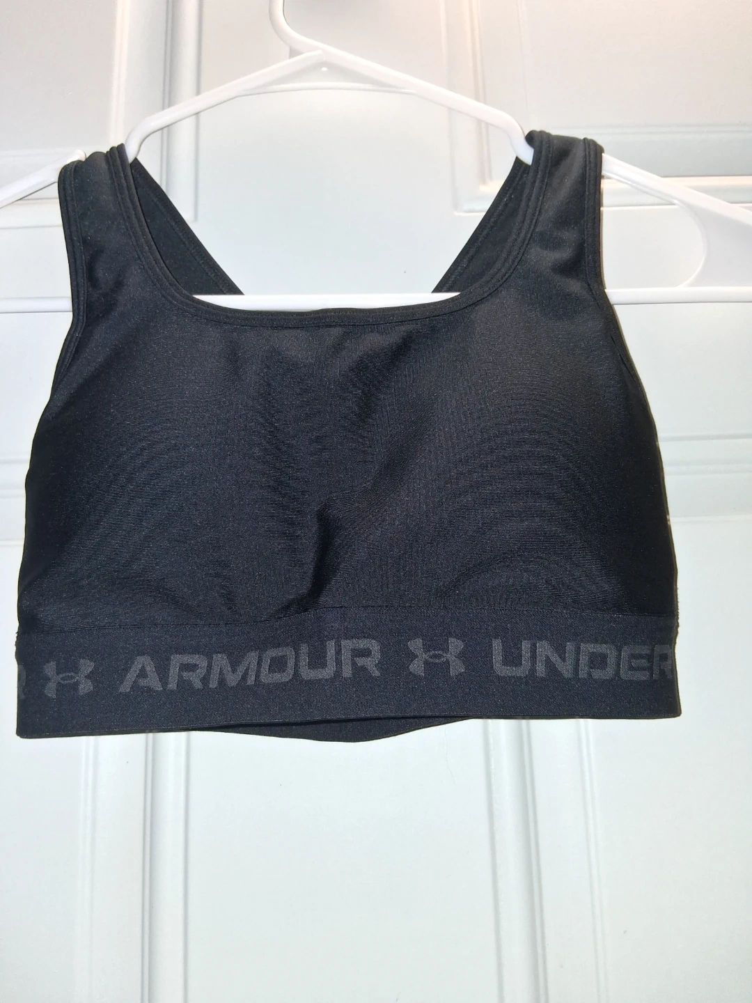 This Under Armour sports bra is black and features a compression fit. It's a size S/P/CH. The brand name is printed on the band.
