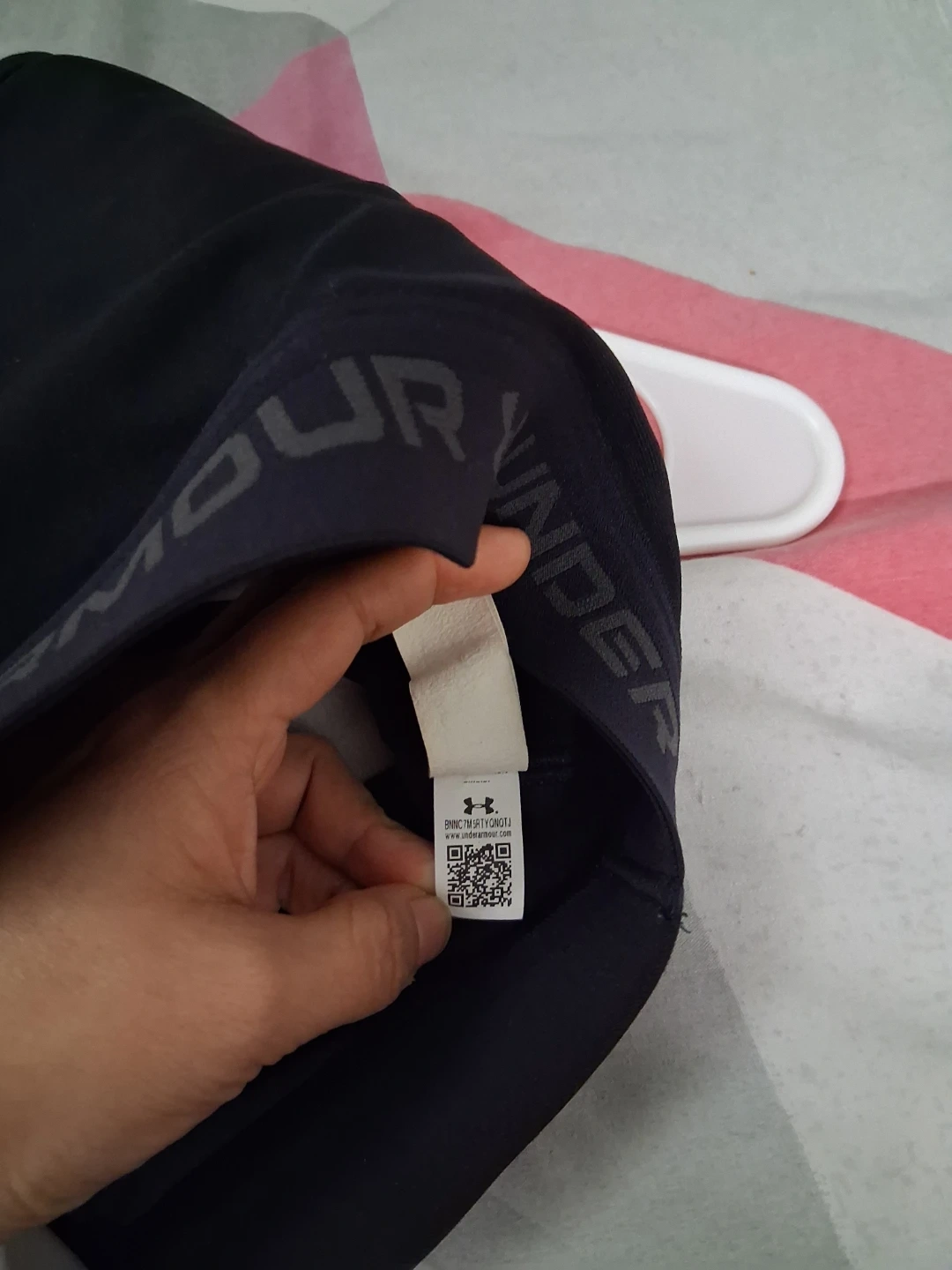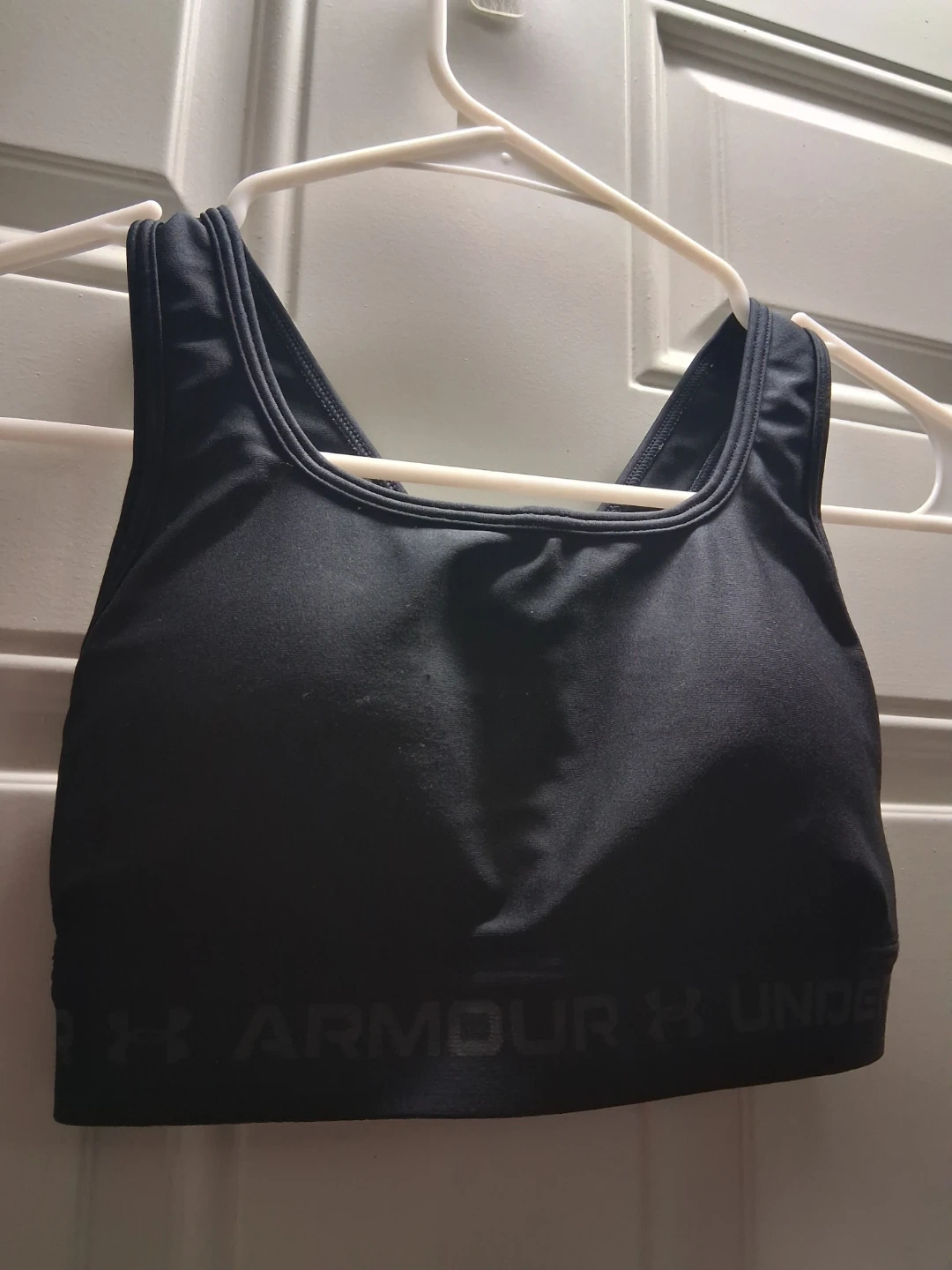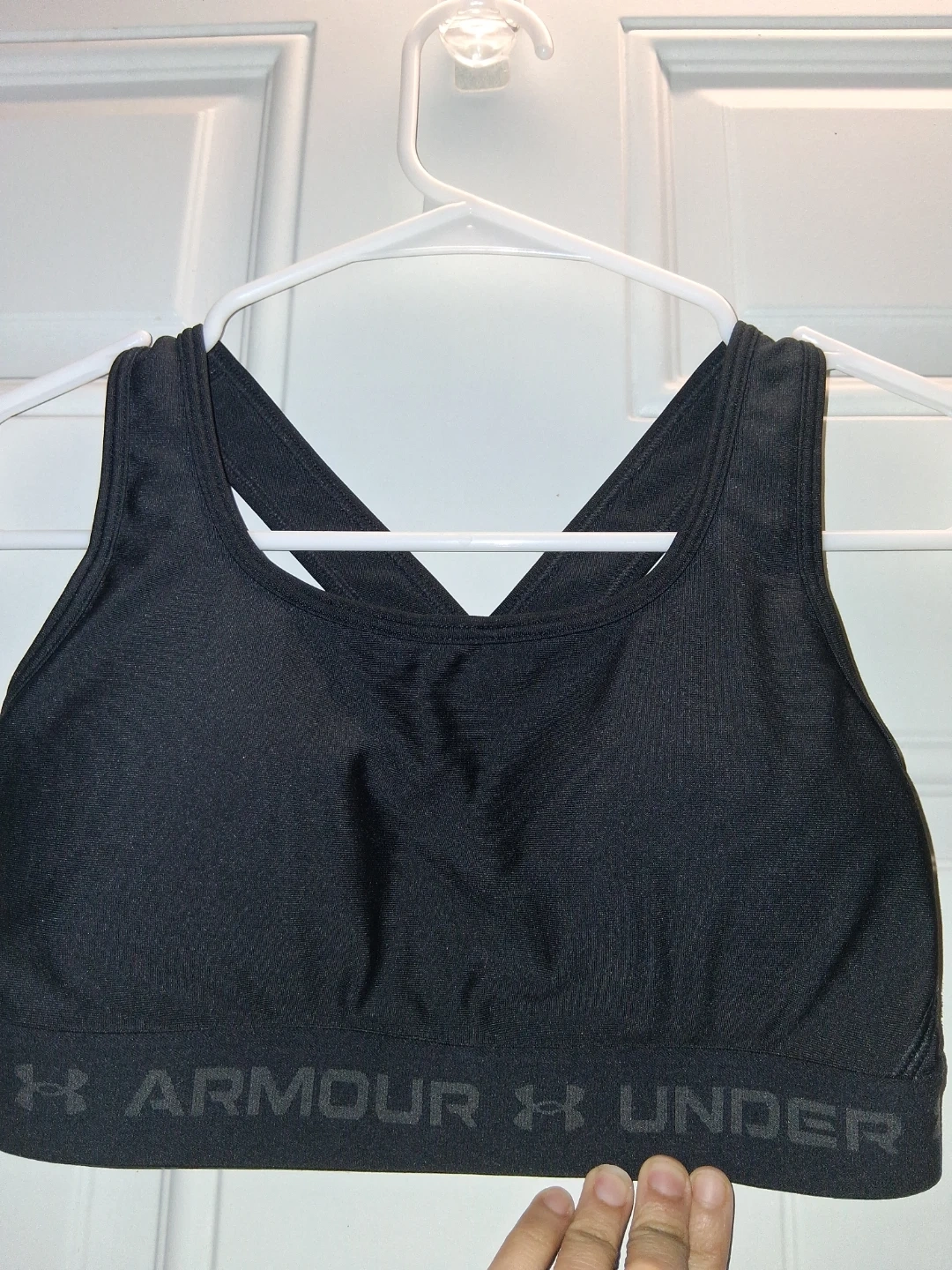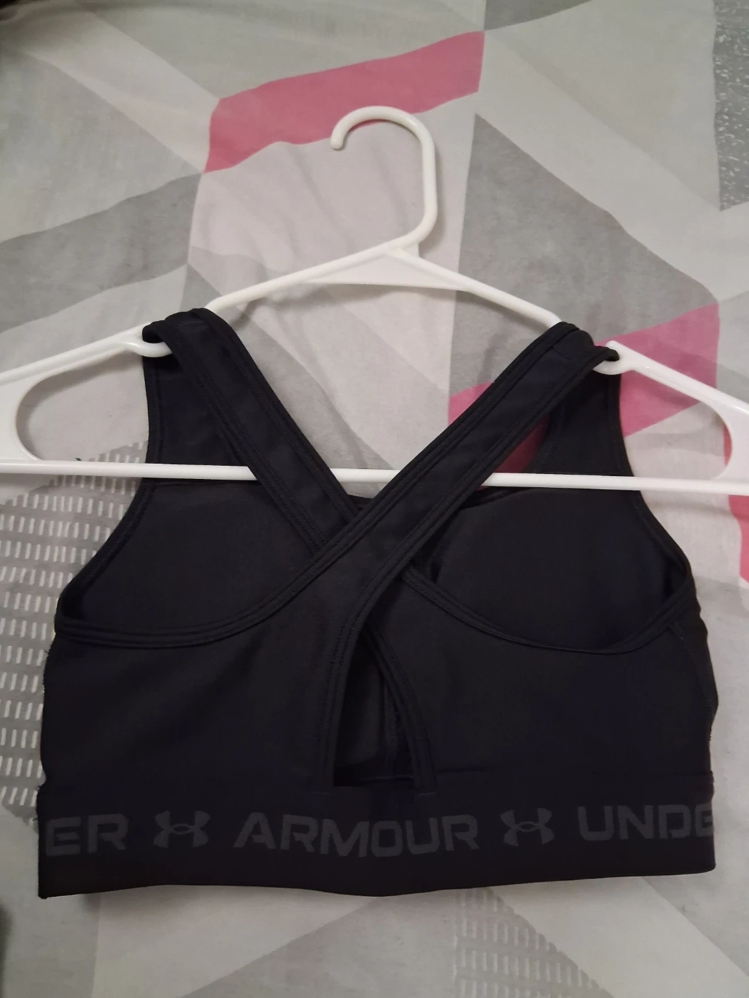 This Under Armour sports bra is black and features a compression fit. It's a size S/P/CH. The brand name is printed on the band.
