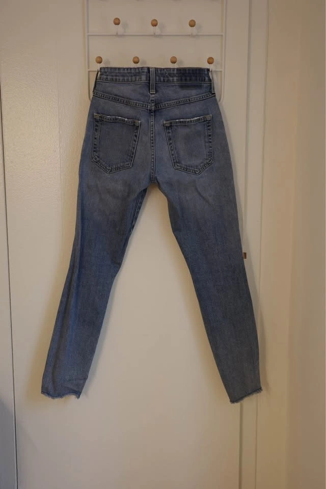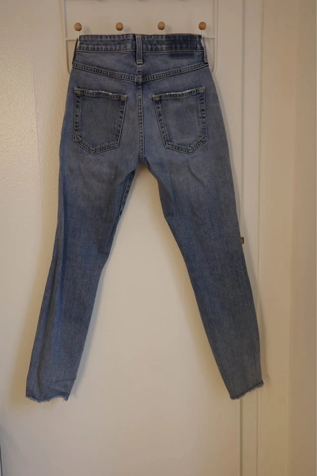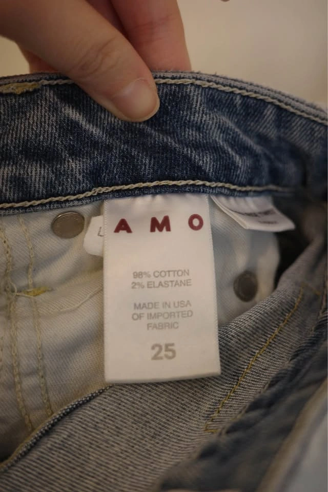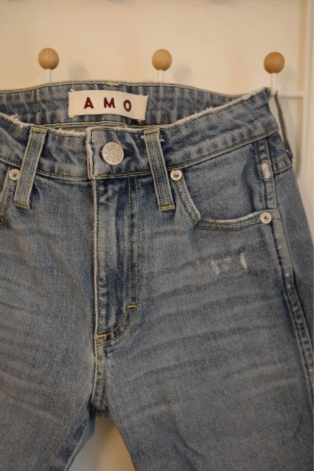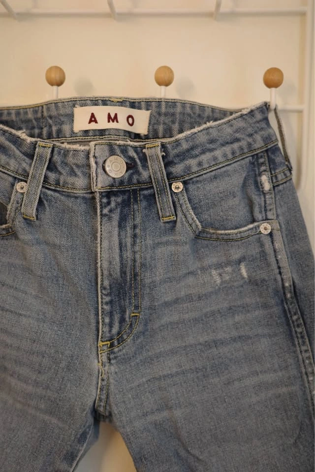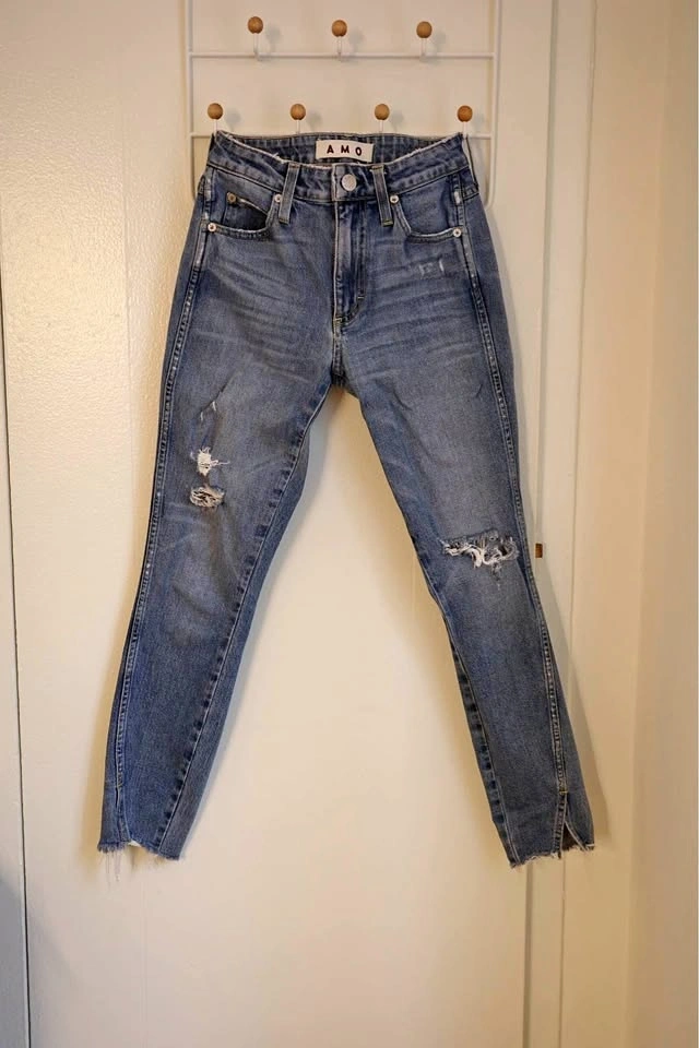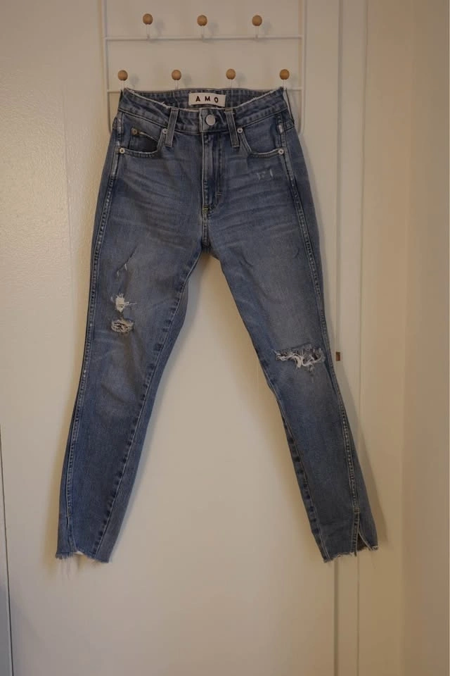 Size 25 Distressed AMO denim jeans in a light blue wash. These pants have a high-rise fit with ripped details on the front legs. The bottom features a unique split raw hem. Material is a stretchy cotton denim with traditional five-pocket styling.