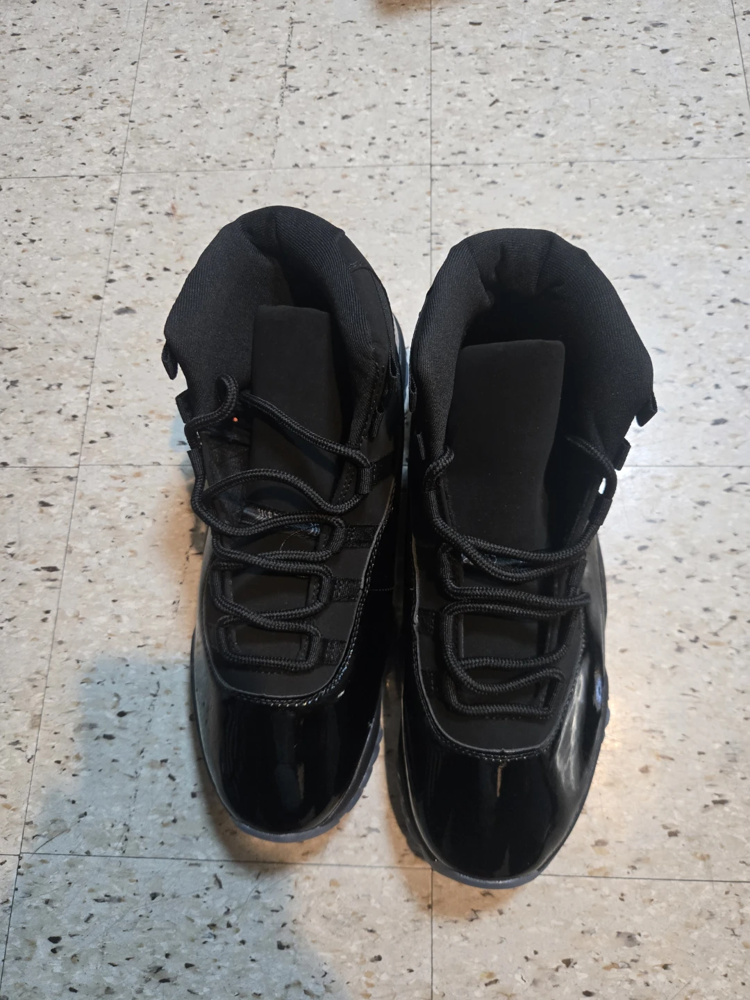 Classic Air Jordan 11 Retro sneakers in a black colorway. Features patent leather accents and a durable sole. Lace-up closure ensures a snug fit.