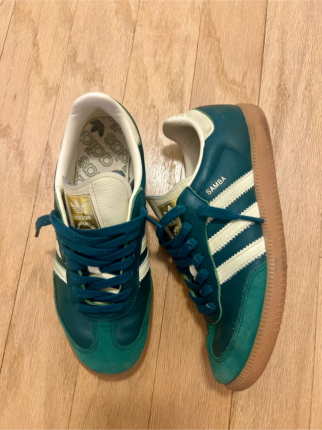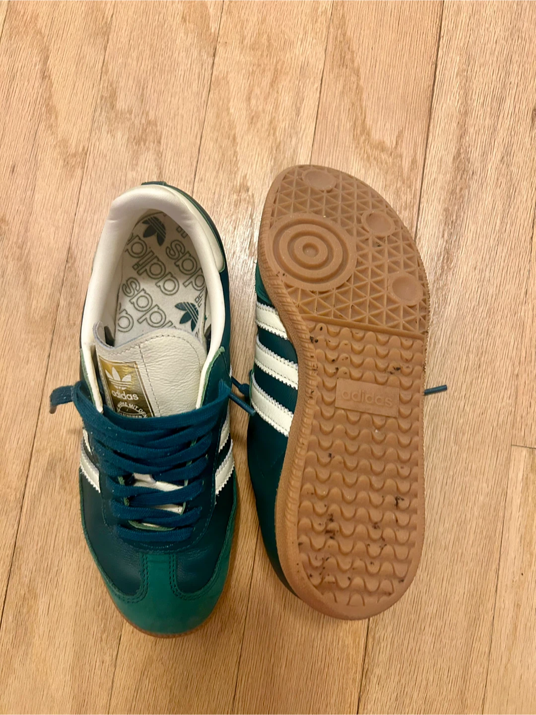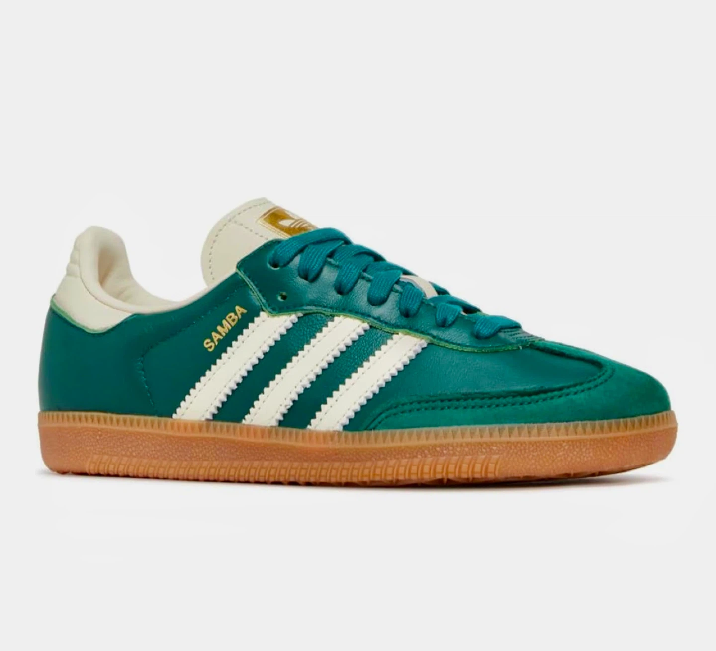 Adidas Samba sneakers in green color with white stripes (Collegiate Green Gum). Features a gum sole and lace-up closure. Classic silhouette and comfortable design.