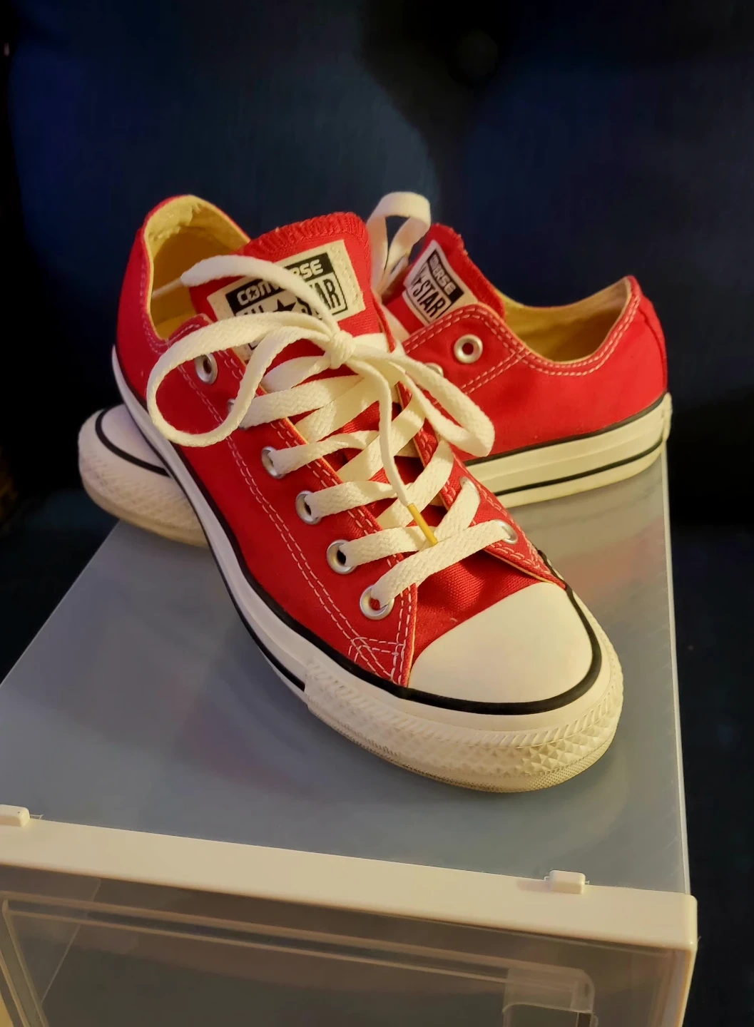 Classic red low-top Converse Chuck Taylor All Stars. Features a canvas upper and rubber sole. Lace-up closure for a secure fit. These iconic sneakers are versatile and comfortable for everyday wear!