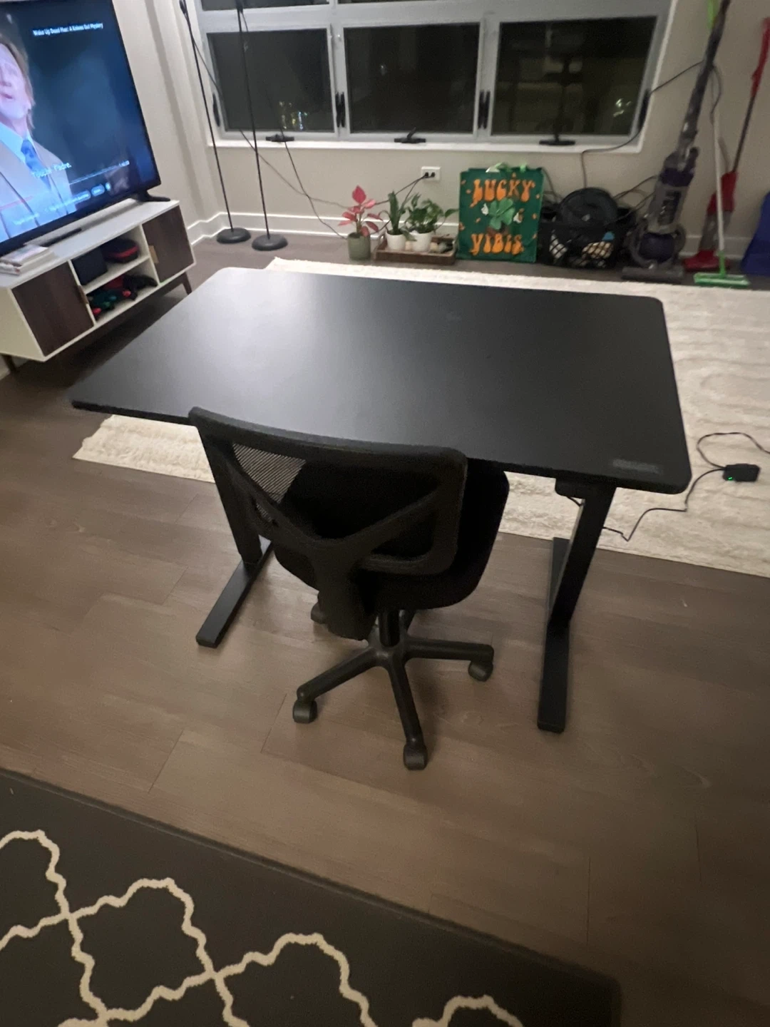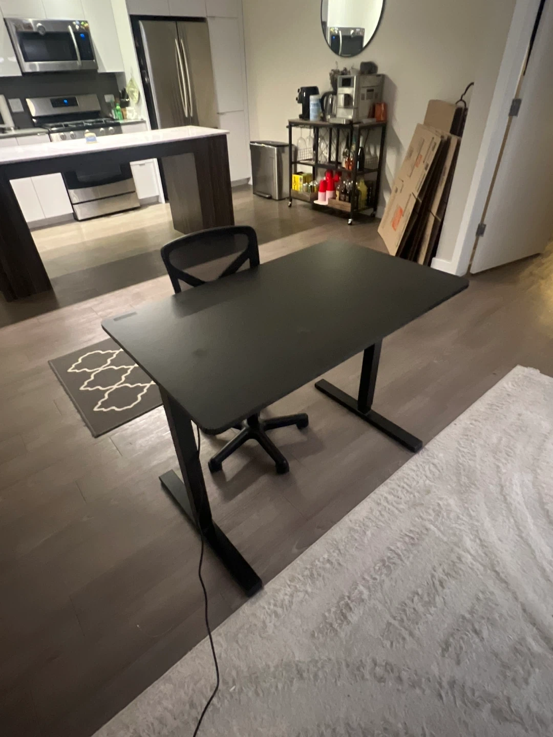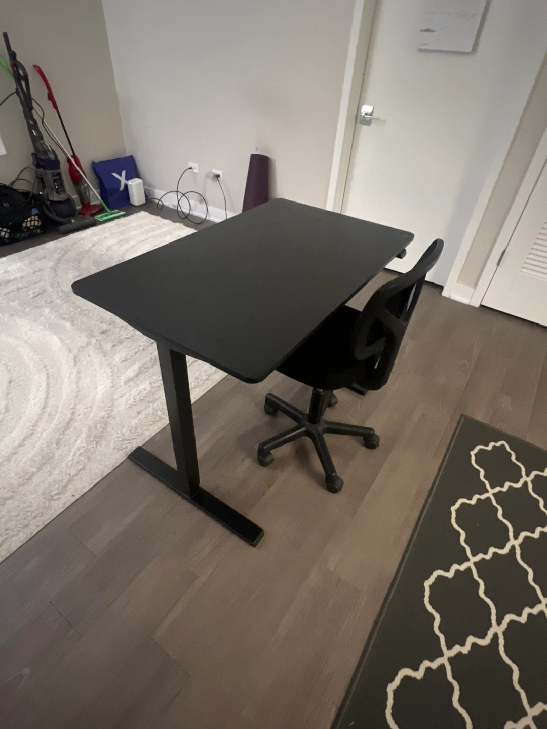 Selling a black adjustable standing desk. It's in good condition and ready for a new home! Perfect for setting up your home office or gaming station! Standing desk Max Height of 4 feet! And chair comes with it! (Pickup only)