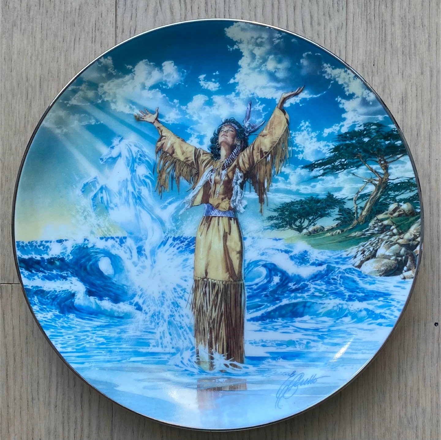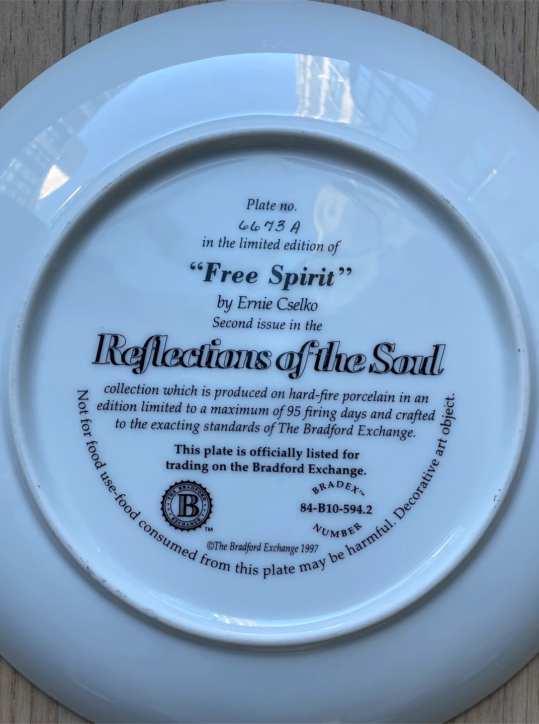 Selling a "Free Spirit" plate by Ernie Cselko, the second issue in the Reflections of the Soul collection. This plate is produced on hard-fire porcelain in an edition limited to a maximum of 95 firing days and crafted to the exacting standards of The Bradford Exchange. Plate number is 6693A. diameter 9 inches