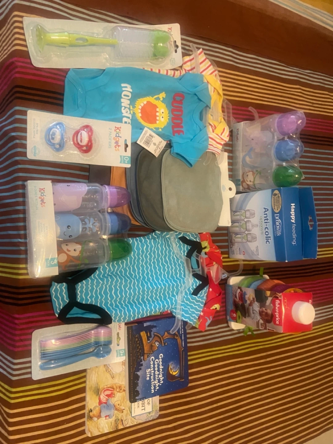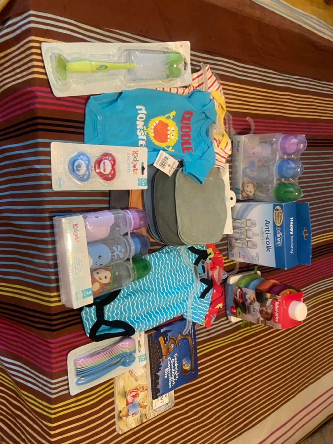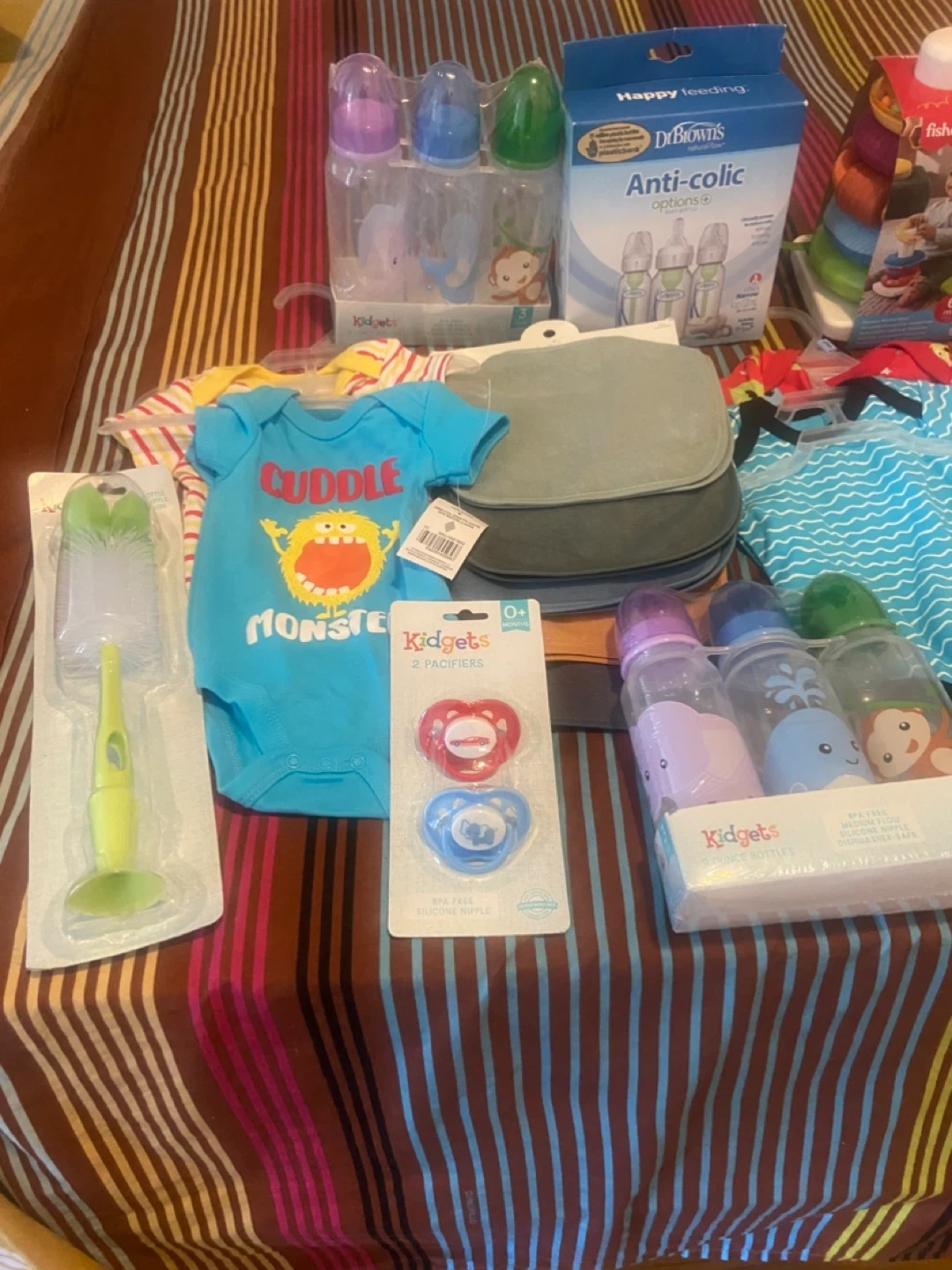 This is a Baby Newborn/ infant package deal. It's included a a 3pk kidgets company 9 ounces bottles it is 2 packs of them making it 6 bottles.And 3 feeding Anti colic for Spitting up, burping and gas With a bonus pacifier included. Two pacifiers ,12 pk infant spoons ,bottle & Nipple brush Cleaner, 10 bibs Certified oeko-tex bibs, 0/3 months Onesies 2pk, 6/9 Months Onesies 2 pk, Fisher Price six months Since they're rocking stack pyramid toy And two-story books