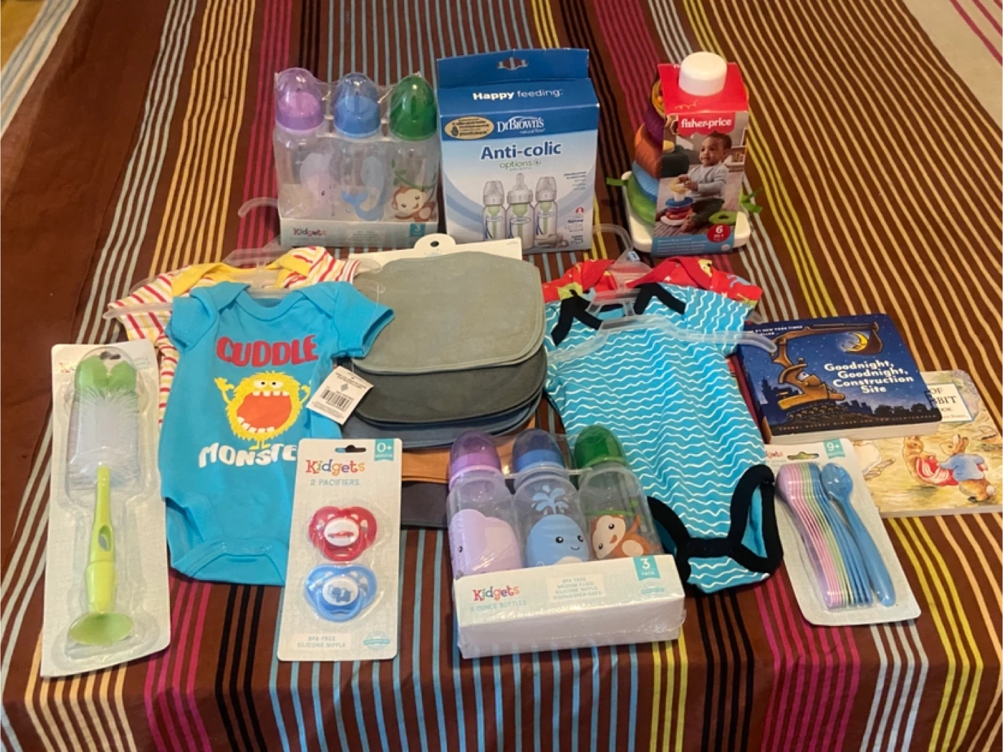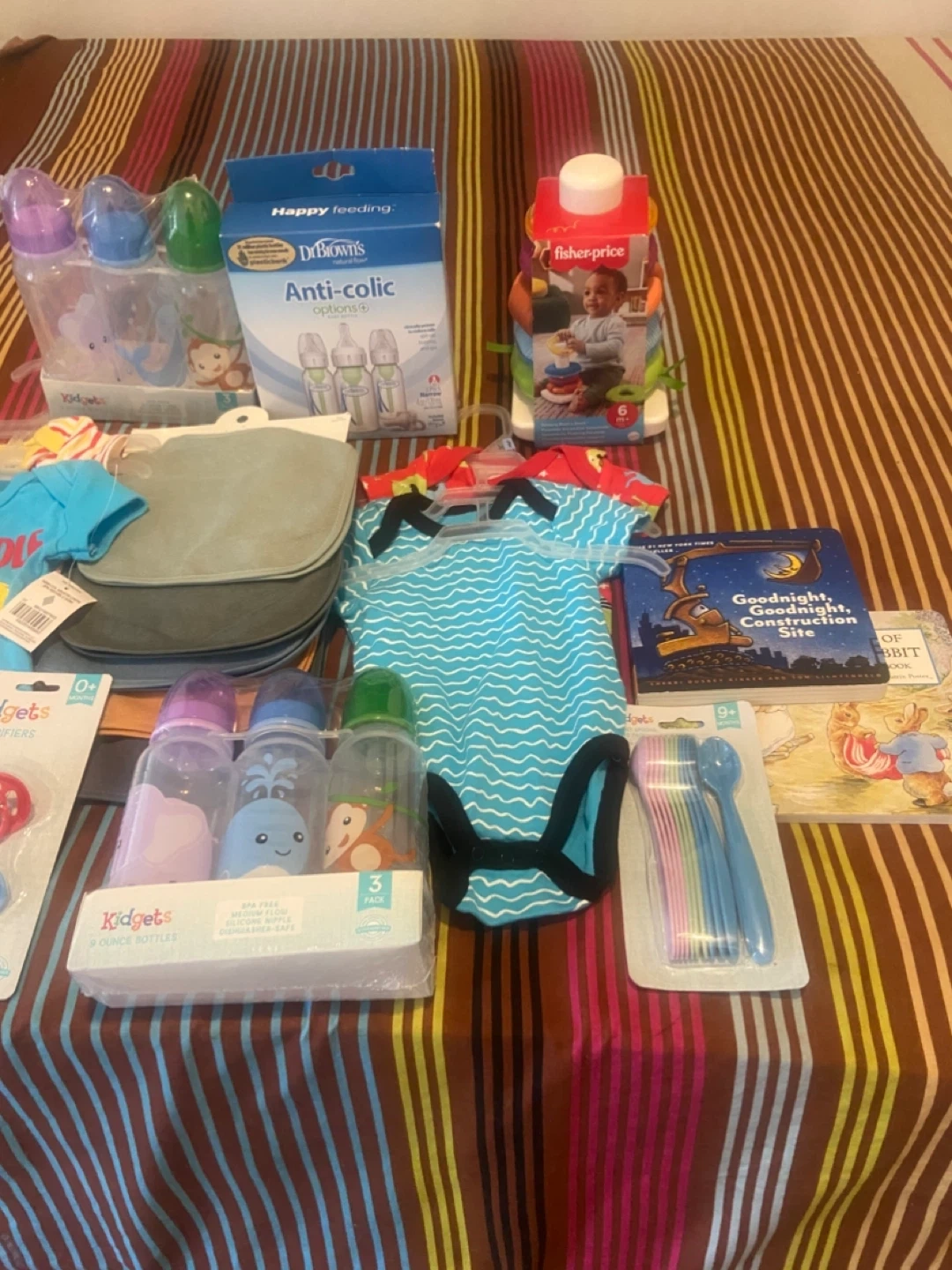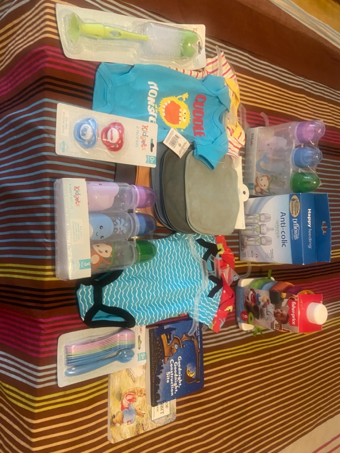 This is a Baby Newborn/ infant package deal. It's included a a 3pk kidgets company 9 ounces bottles it is 2 packs of them making it 6 bottles.And 3 feeding Anti colic for Spitting up, burping and gas With a bonus pacifier included. Two pacifiers ,12 pk infant spoons ,bottle & Nipple brush Cleaner, 10 bibs Certified oeko-tex bibs, 0/3 months Onesies 2pk, 6/9 Months Onesies 2 pk, Fisher Price six months Since they're rocking stack pyramid toy And two-story books