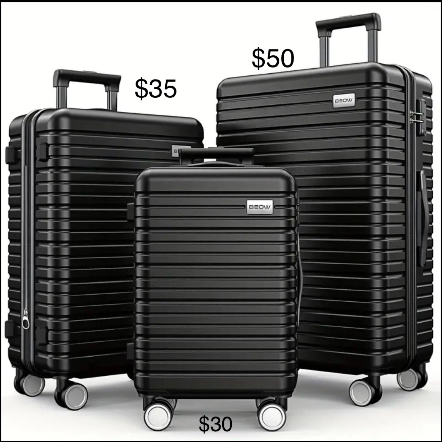 Selling a set of BEOW black luggage pieces. There's a small carry-on size for $30, a medium-sized suitcase for $35, and a larger one for $50. All are in great shape and ready for your next trip!