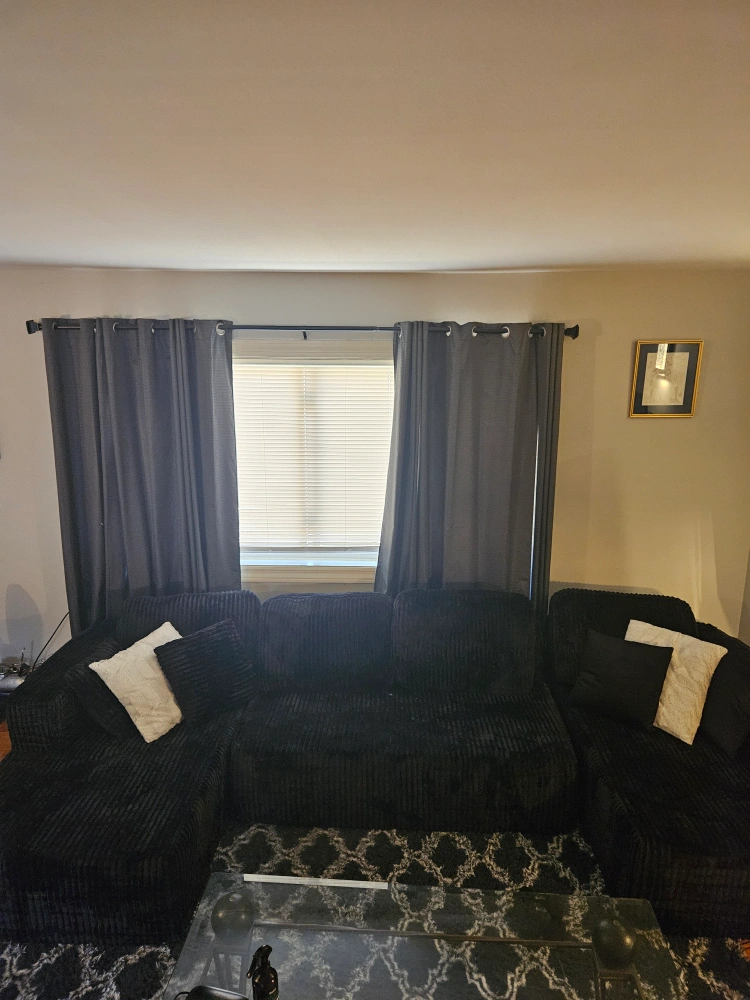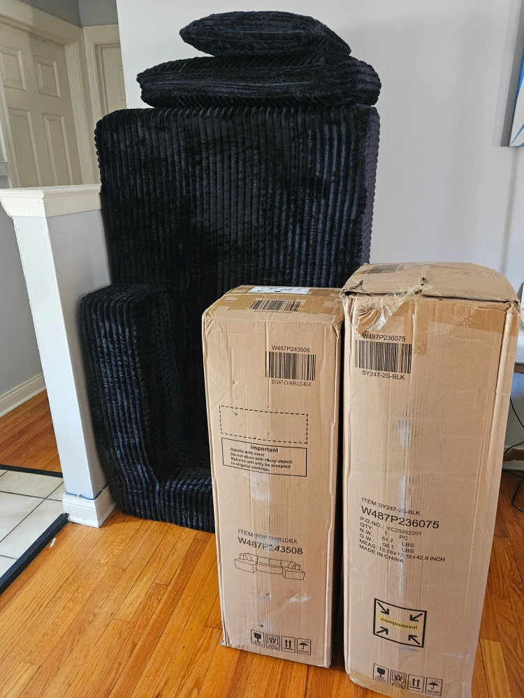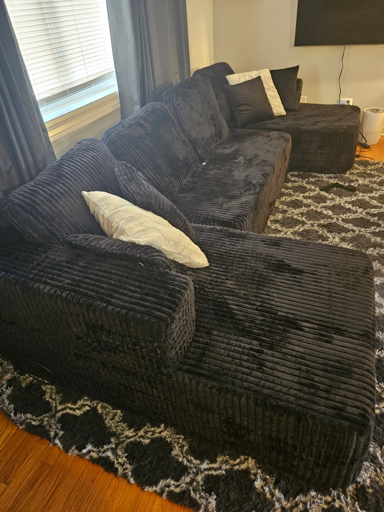 Selling a large, comfortable black corduroy modular sectional sofa. It's in great condition and comes with the original boxes. This sofa is perfect for a living room or entertainment space! The modular design allows you to configure it to fit your needs. One piece is out of box but never used.