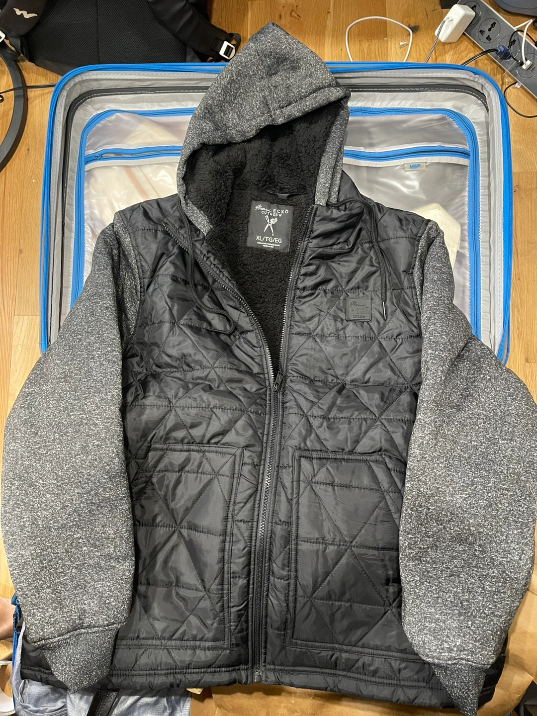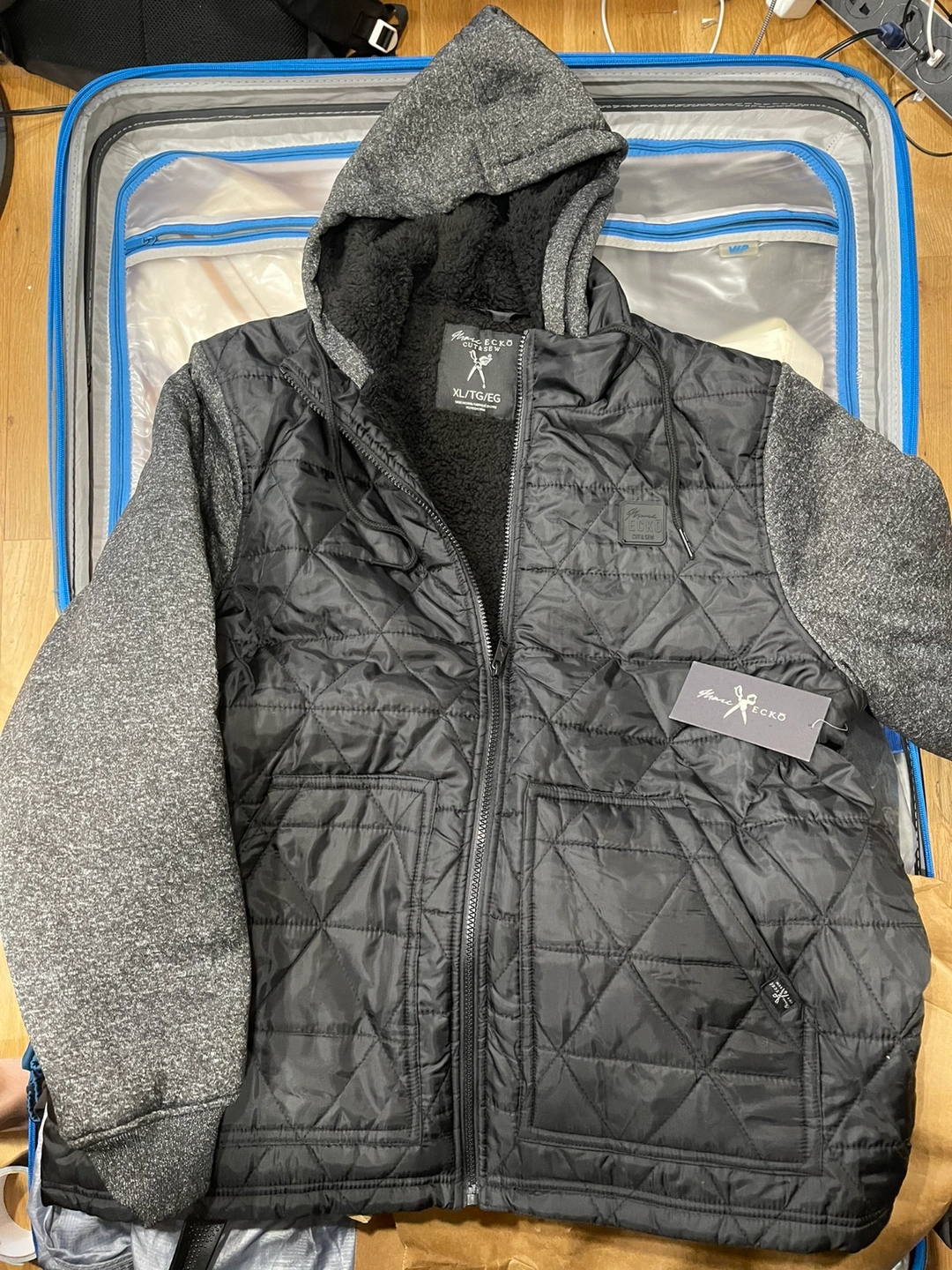 Selling a brand puffer jacket! It's black with gray sleeves and a hood. The size is XL/TG/EG. Selling it because bought bigger size.