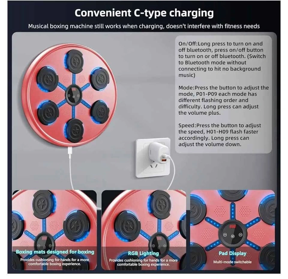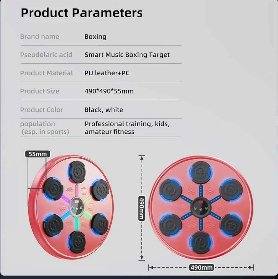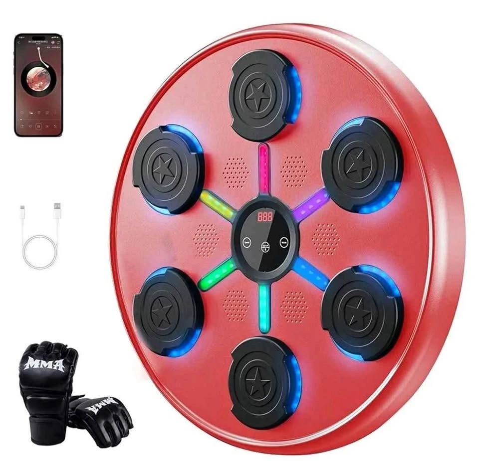 New Bluetooth Music Boxing Machine with Boxing Gloves. The impact surface is made of high-elastic foam material, which has strong rebound and shock-absorbing effects, and is equipped with a pair of boxing gloves to protect your hands. Other parts are made of durable PU material, which can withstand long-term use and high-intensity training whether it is home use or commercial gym. The music boxing machine has 9 modes and 9 speeds, which is a perfect choice for professionals and beginners. It can intelligently identify music and enhance the visual experience through LED light effects, providing an immersive experience. The boxing machine can improve your reaction speed and body coordination, achieve comprehensive muscle training and get entertainment enjoyment. This smart music boxing machine is equipped with upgraded speakers. When you hit the lit target, the device will emit music and light effects, and the LED display will show your hit count to stimulate your interest in exercise. The smart boxing music machine supports Bluetooth pairing, and you can choose your favorite songs during boxing training. Surround speakers and cool lights bring you the best audio-visual effects and the best exercise experience. The boxing music fitness machine comes with a pair of gloves to protect your hands. If you have your own boxing gloves, you can also use them for training. OORUN boxing music machine is wall-mounted, saving space and installation time. Use double-sided tape and Velcro to fix the Bluetooth boxing machine to the wall, and you can own a home boxing machine without drilling holes in the wall. You don't need to go to the gym to exercise at home, saving your time and money. Item Package Dimensions L x W x H 20 x 19.5 x 2.75 inches Package Weight 2.77 Kilograms Item Dimensions LxWxH 19.3 x 19.3 x 2.16 inches Item Weight 4.41 Pounds Brand Name ZWOTNDT Warranty Description 1 year Model Name Music Boxing Machine Color Red Material Plastic Suggested Users unisex-adult Number of Items 1 Manufacturer ZWOTNDT Part Number JH-QJ-01 Included Components Velcro, Charging cable, Instructions, A pair of professional gloves Size 19.3*19.3*2.16"