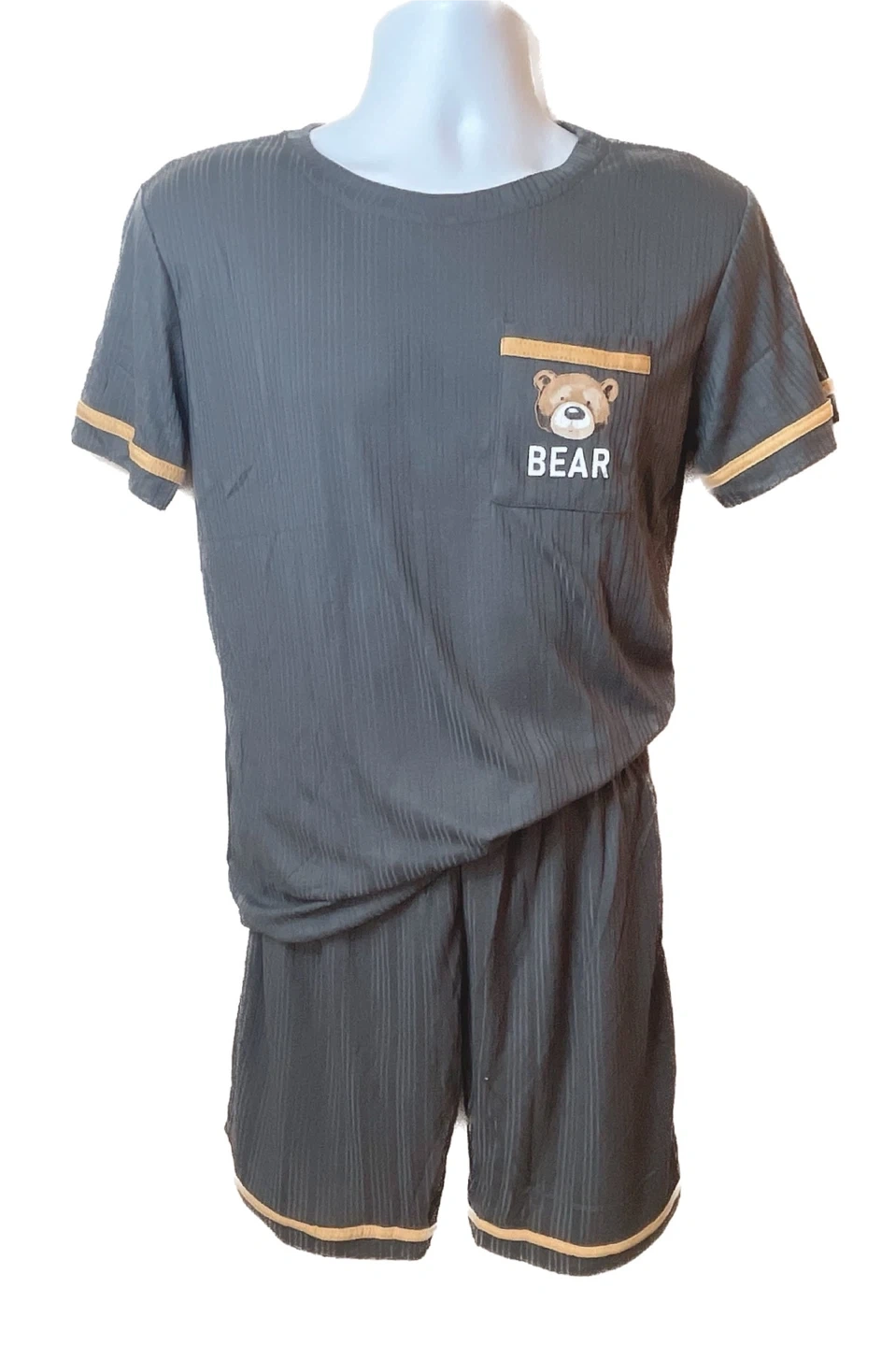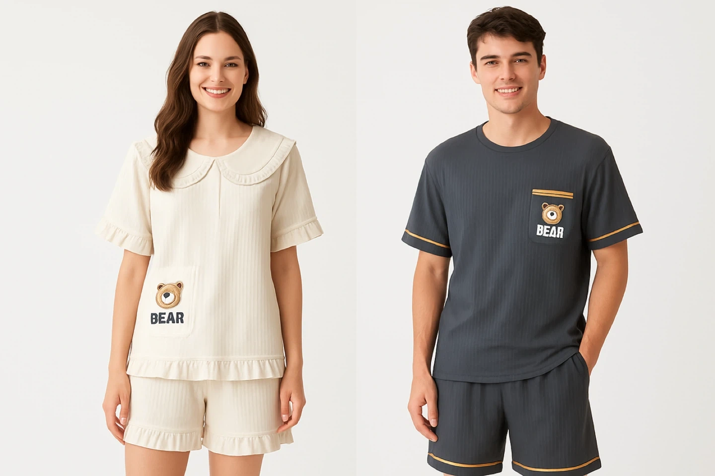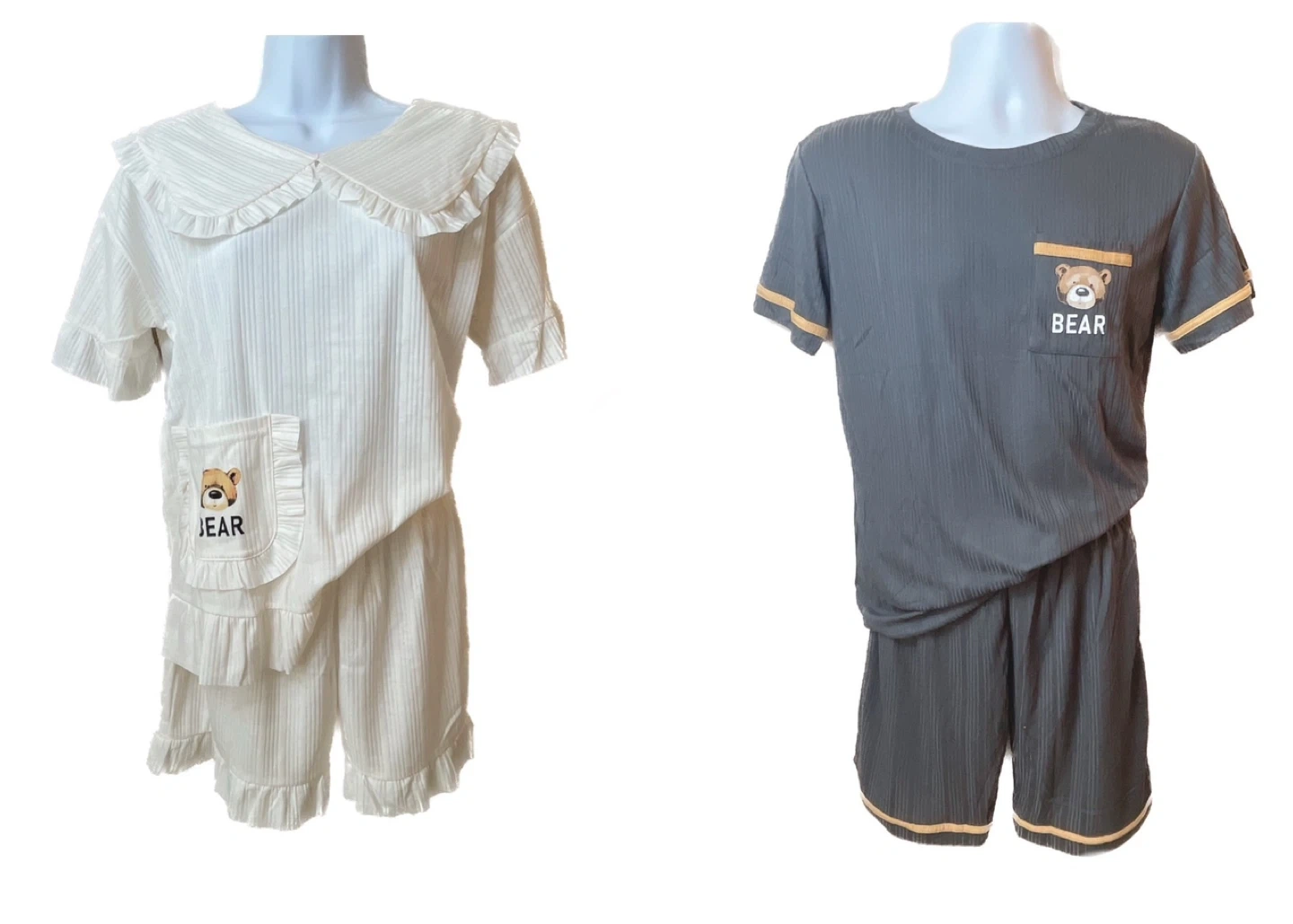 Selling a cute pajama set with a bear design! The set includes a short-sleeved top and shorts. One set is white (women) with a collared neck and the other is gray (male). Perfect for lounging around the house or a comfy night's sleep! 2 sets/30 Comes in different sizes, runs small.