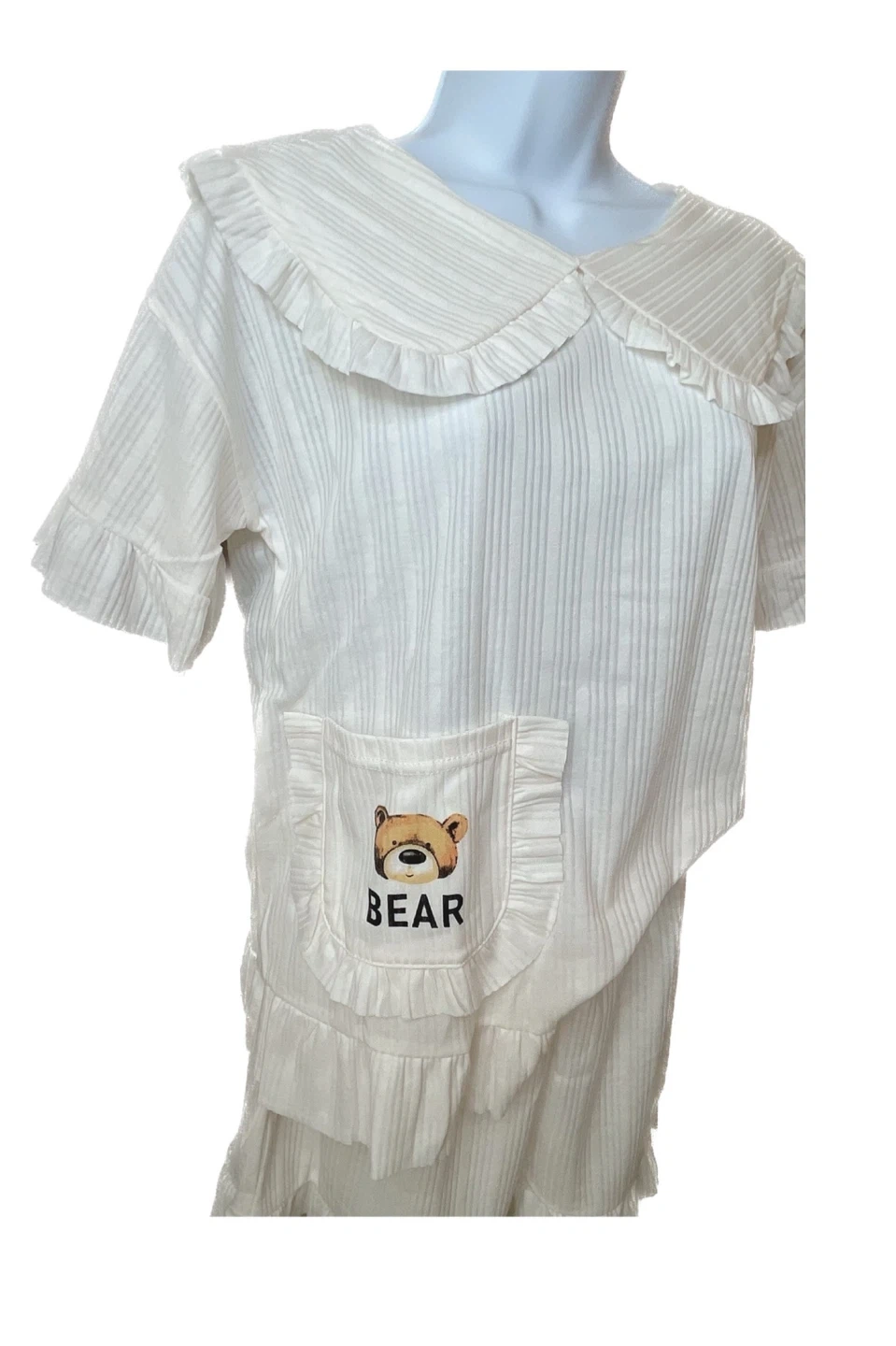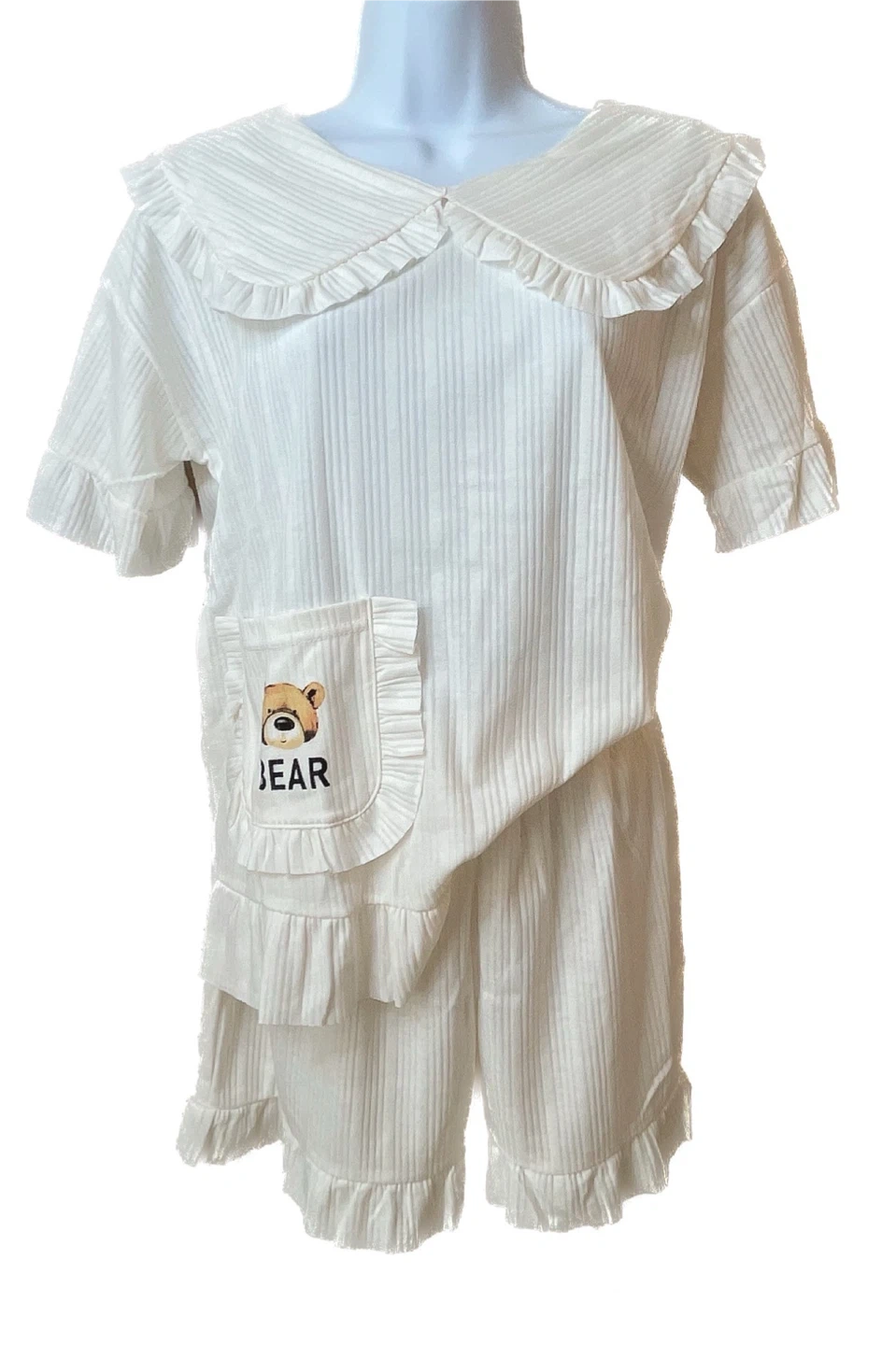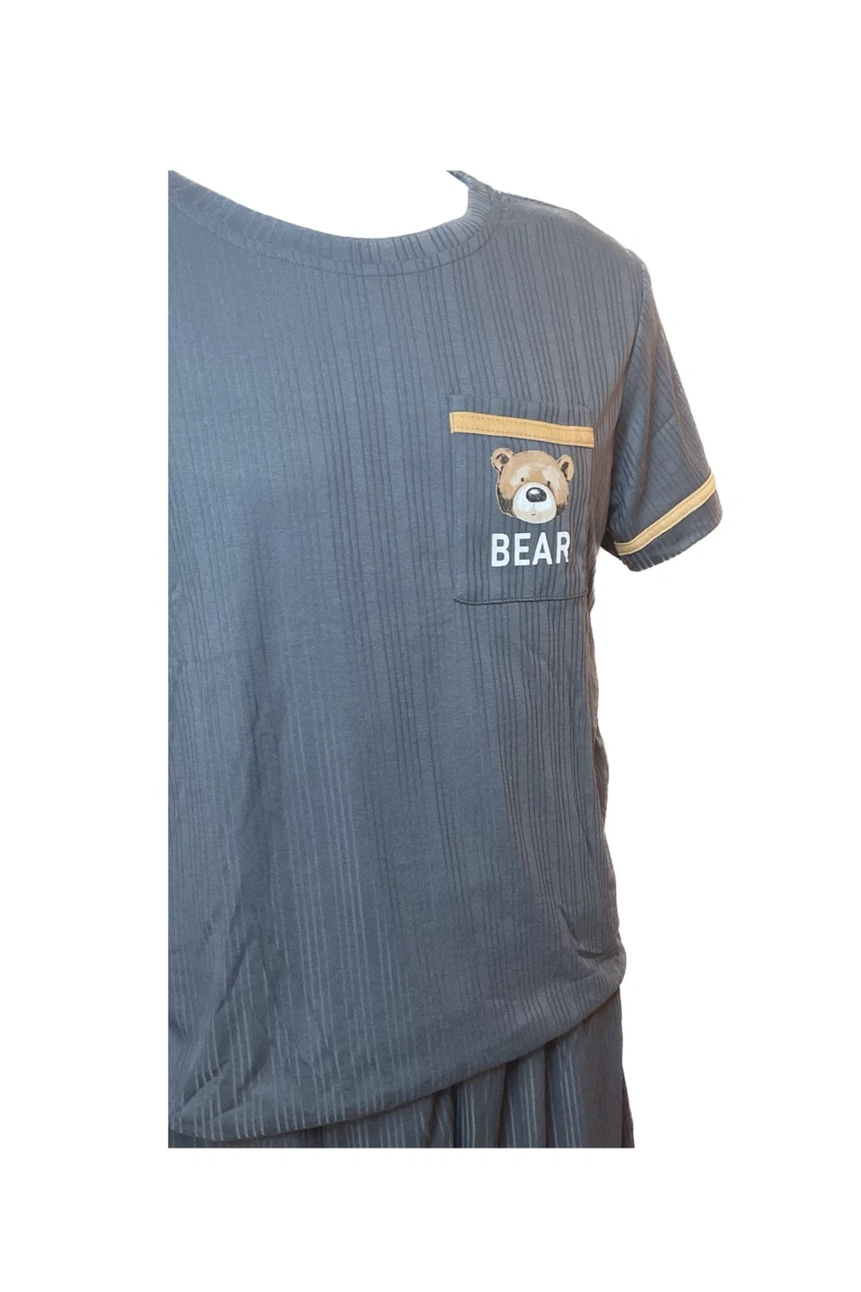 Selling a cute pajama set with a bear design! The set includes a short-sleeved top and shorts. One set is white (women) with a collared neck and the other is gray (male). Perfect for lounging around the house or a comfy night's sleep! 2 sets/30 Comes in different sizes, runs small.