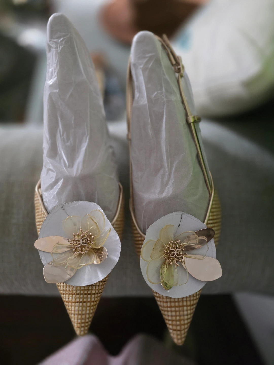 15Selling a pair of Sam Edelman heels in size 9. They are gold with a cute flower detail on the toe. Comes with the original box! Paid 108.00 . never wore them