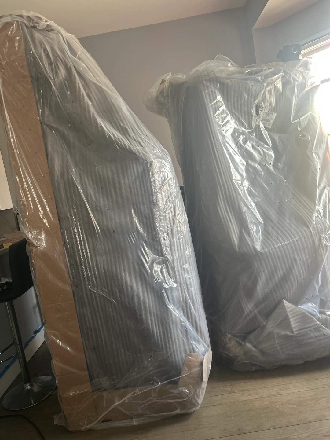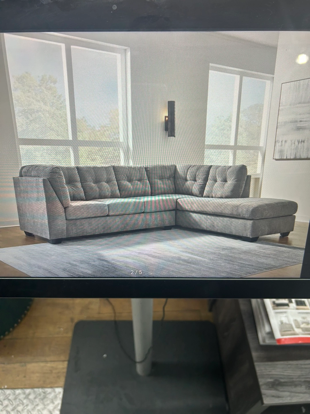 Grey fabric sectional sofa. Still in plastic wrapping. Never used. Modern design. Perfect for living room.