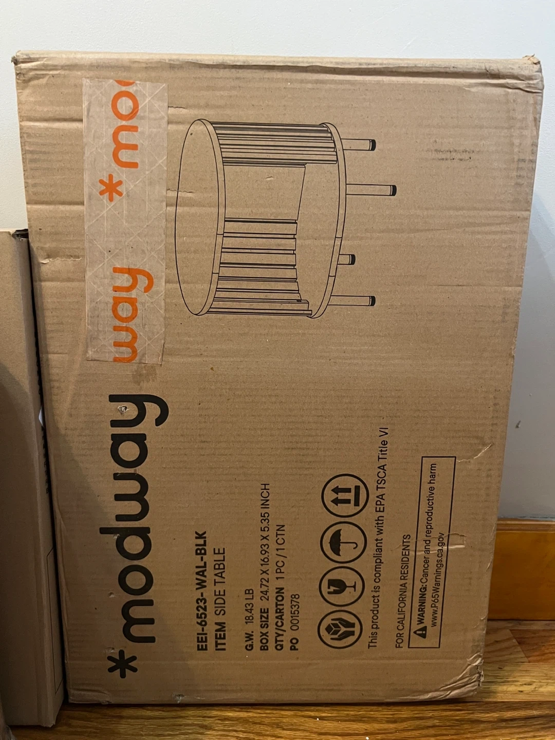 Selling a Sillou Moxie Side Table in walnut and black! It has an open center storage area and metal legs with non-marking foot caps. The construction is MDF and particleboard. Brand new, need to build up, box is included! Price is negotiable with reason offer.