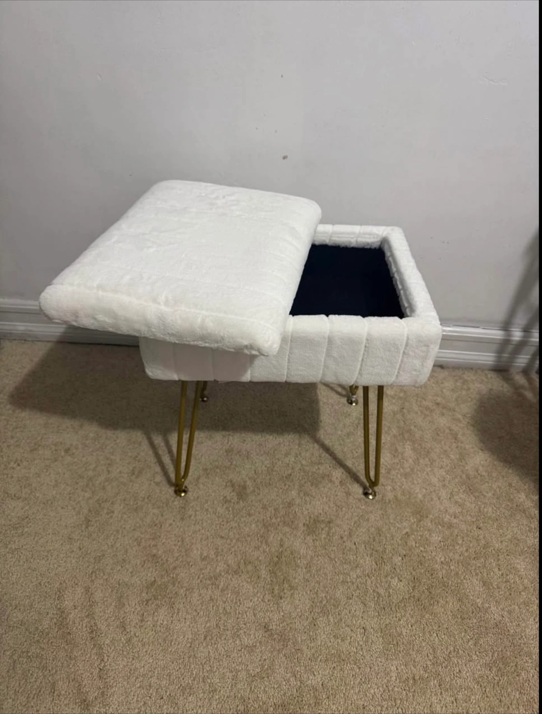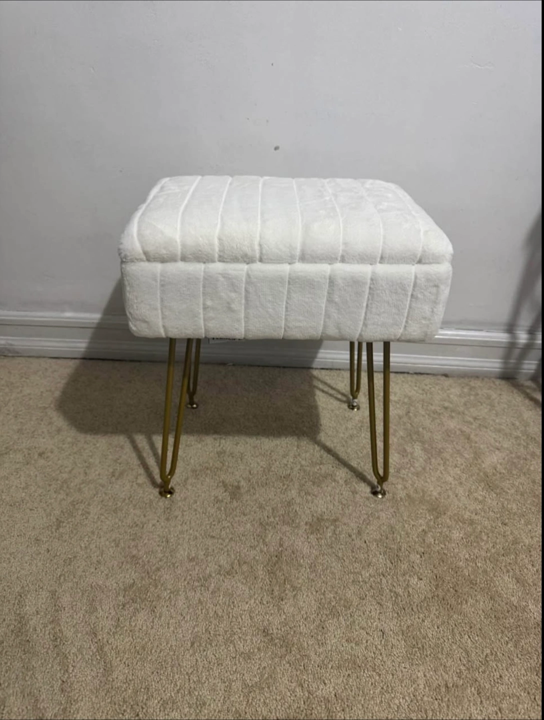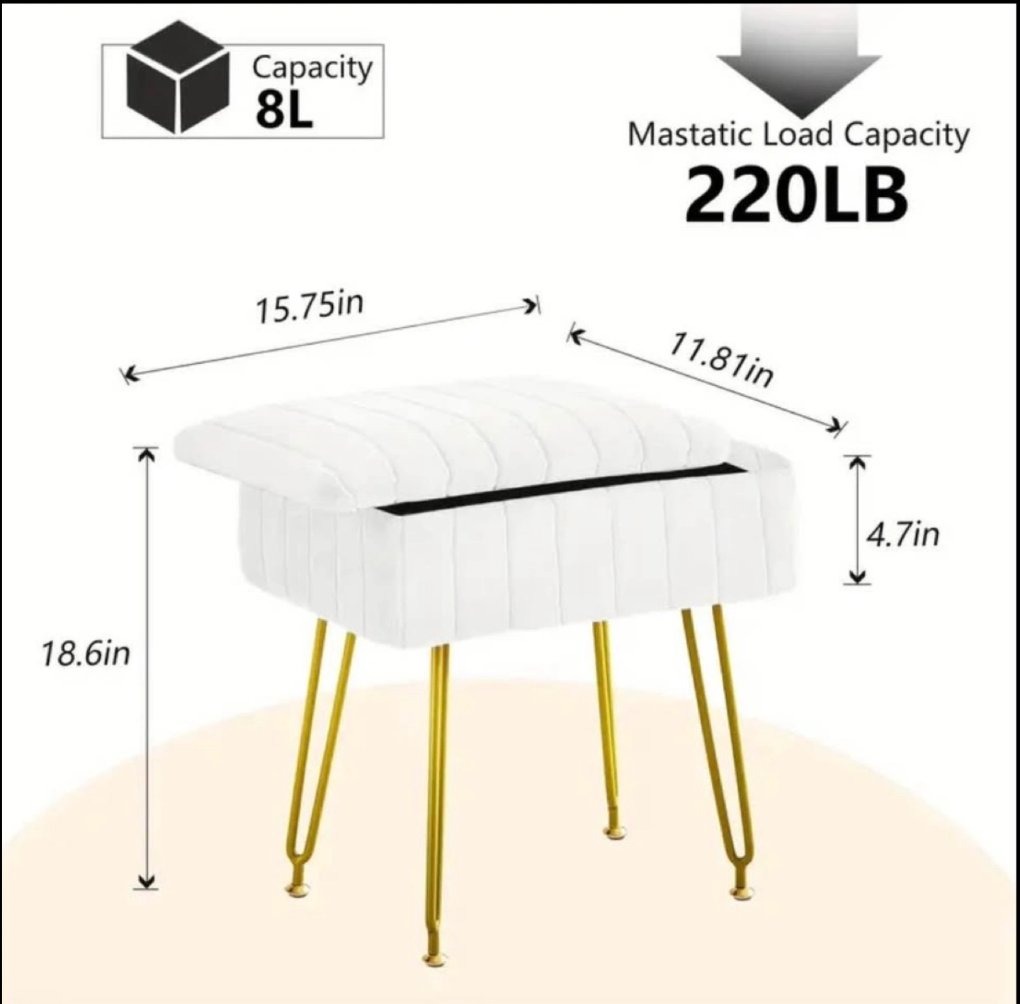 This is a white storage ottoman foot stool. It has gold colored metal legs. The capacity is 8L and the maximum load capacity is 220LB. The dimensions are approximately 15.75in x 11.81in x 18.6in Brand New in box 📦