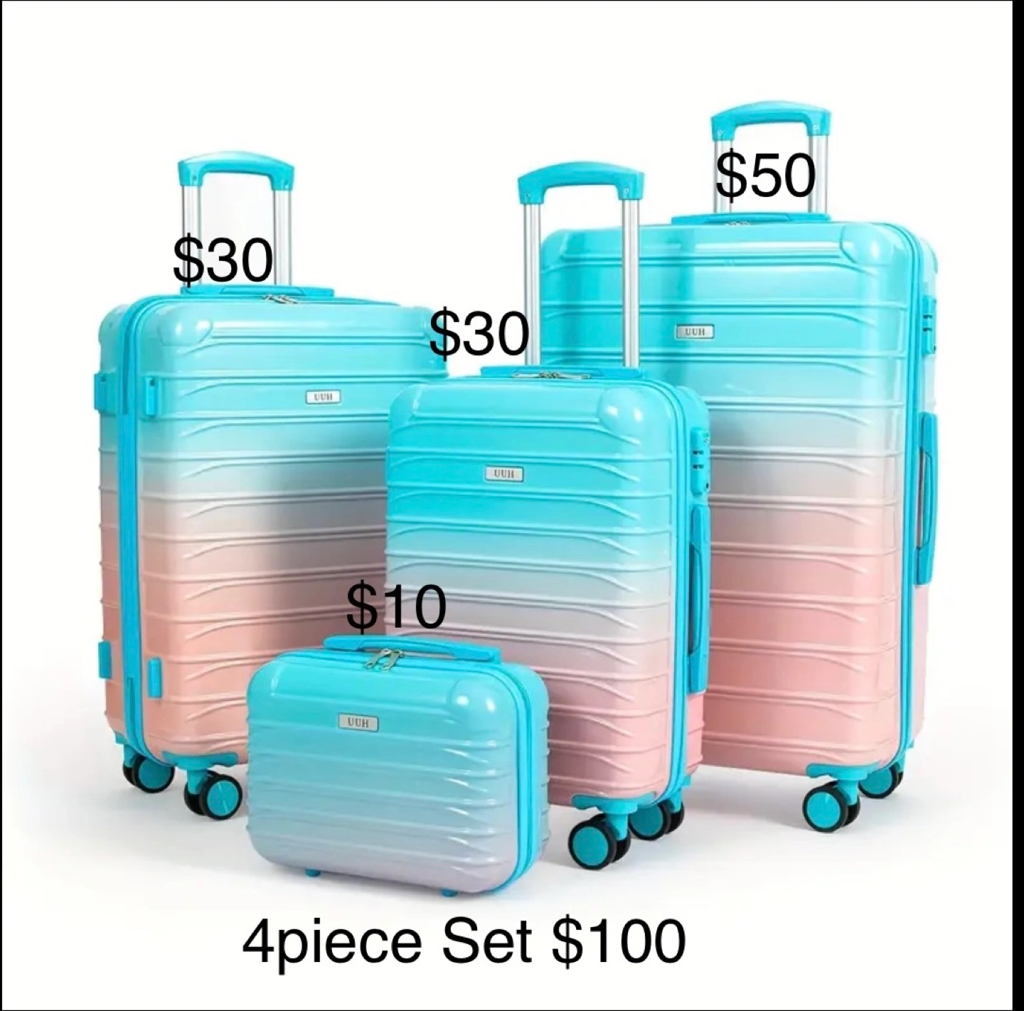 Selling a 4-piece luggage set from Uuh! The set includes various sizes, perfect for all your travel needs. The colors are a pretty blend of light blue and pink. Great for keeping your belongings organized and stylish on the go.size:28inch,24inch,20inch