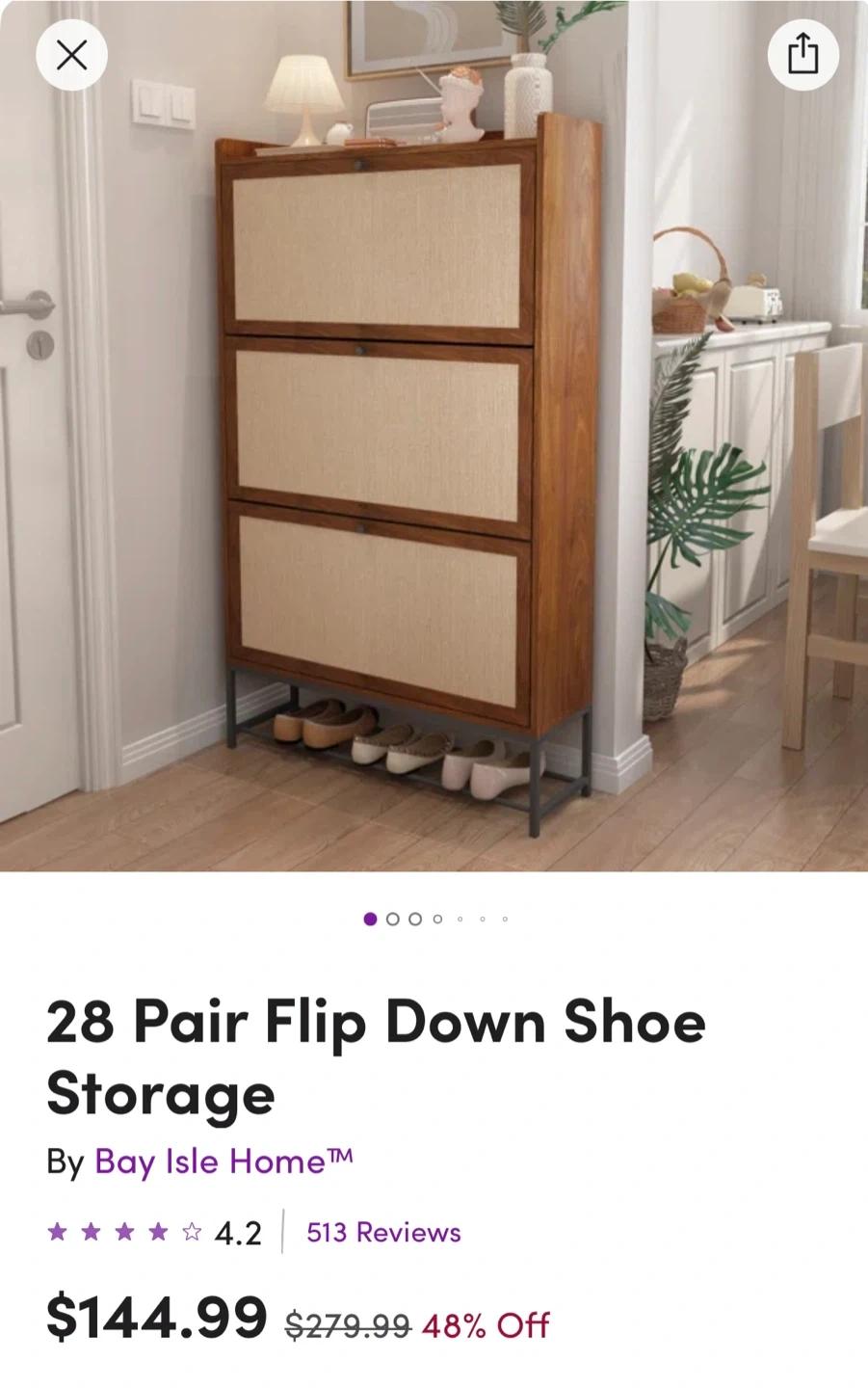 I'm selling a brand new 28 Pair Flip Down Shoe Storage cabinet. Purchased from Wayfair to renew my old one, but unfortunately no time to build and now I am relocating. This cabinet is great for keeping your shoes organized and out of the way. Price is negotiable with reasonable offer. Dimensions: - Height: 53.22 inches - Width: 31.5 inches - Depth: 9.25 inches - Height between shelves: 13.74 inches - Leg Height: 7.87 inches