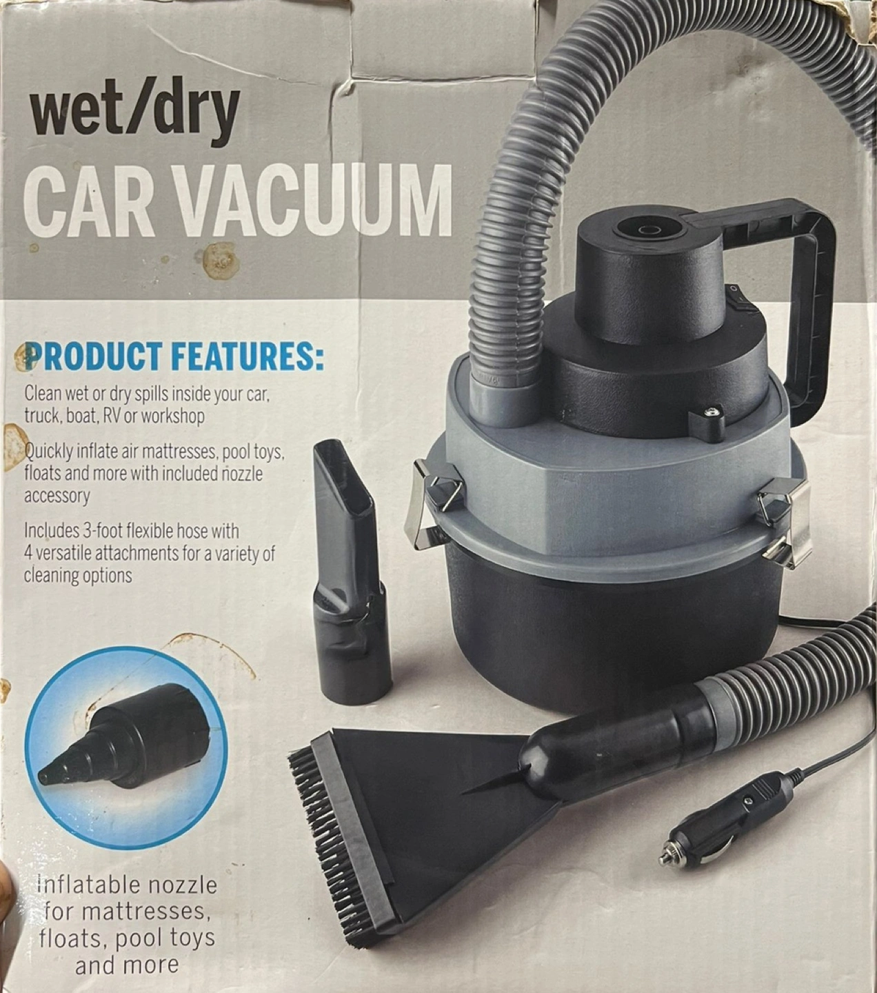 77This is a wet/dry car vacuum that can clean both wet and dry spills inside your car, truck, boat, RV, or workshop. It quickly inflates air mattresses, pool toys, floats, and more. It includes a 3-foot flexible hose with 4 versatile attachments for a variety of cleaning options. The vacuum includes an inflatable nozzle for mattresses, floats, and pool toys, a brush for upholstery, a crevice tool for hard-to-reach areas, and a vacuum head for easy cleaning of larger areas. It also has a 12V DC power adapter that plugs into the 12V outlet receptacle in your car, truck, or RV. It's ideal for cleaning tents or other campground areas and is also great for use in boats