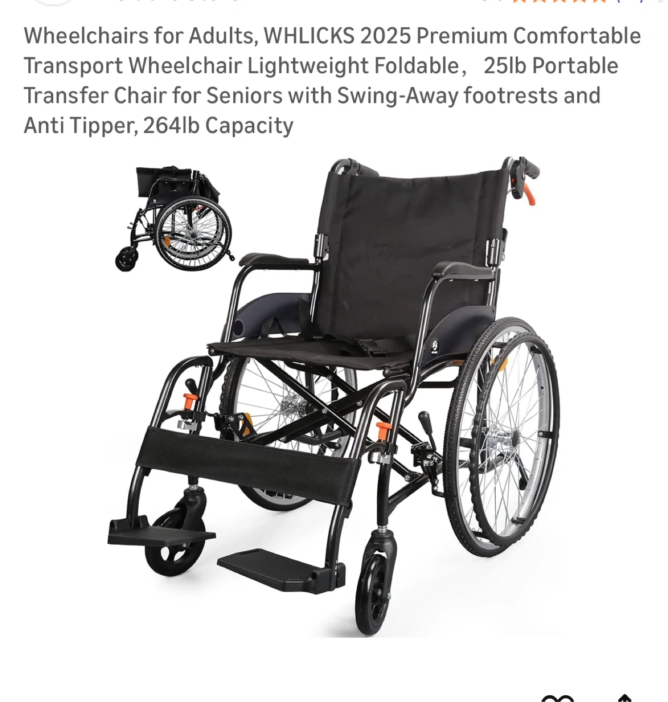 Selling a WHLICKS 2025 Premium Comfortable Transport Wheelchair! It's lightweight and foldable, making it easy to transport. It's a portable transfer chair designed for seniors, featuring swing-away footrests and an anti-tipper design. It has a 264lb capacity. Key features: - Frame Material: Aluminum Alloy - Maximum Load Capacity: 264LBS/120KG - Carton Size: 27.16*13.38*23.6IN It comes in its original box!