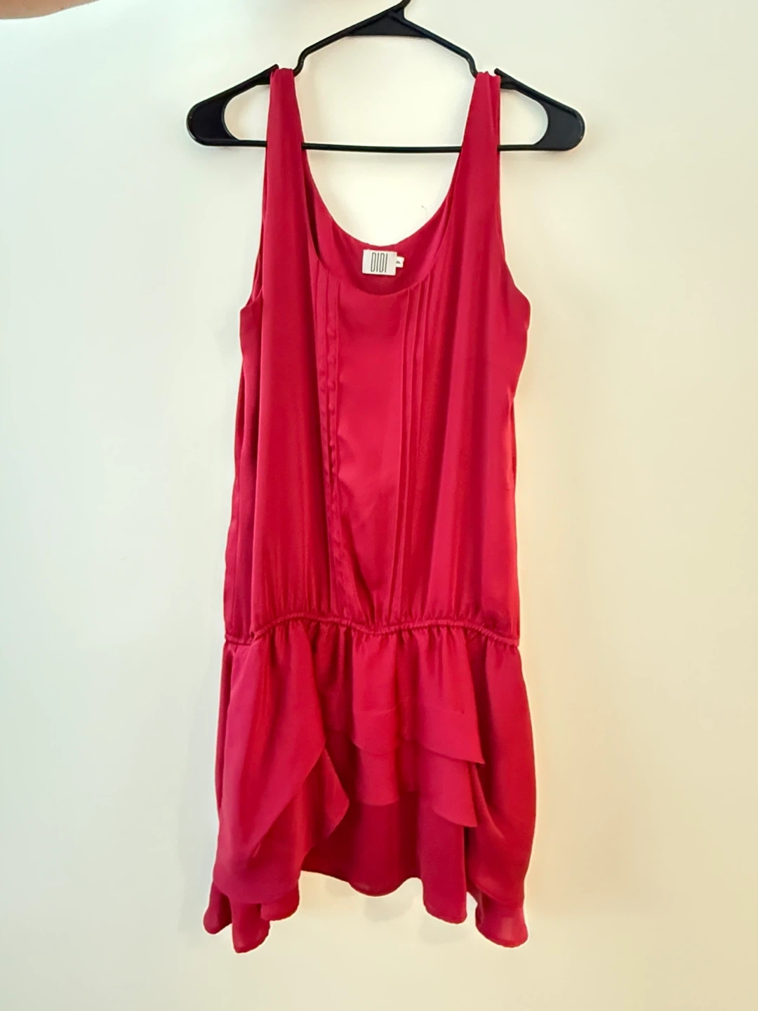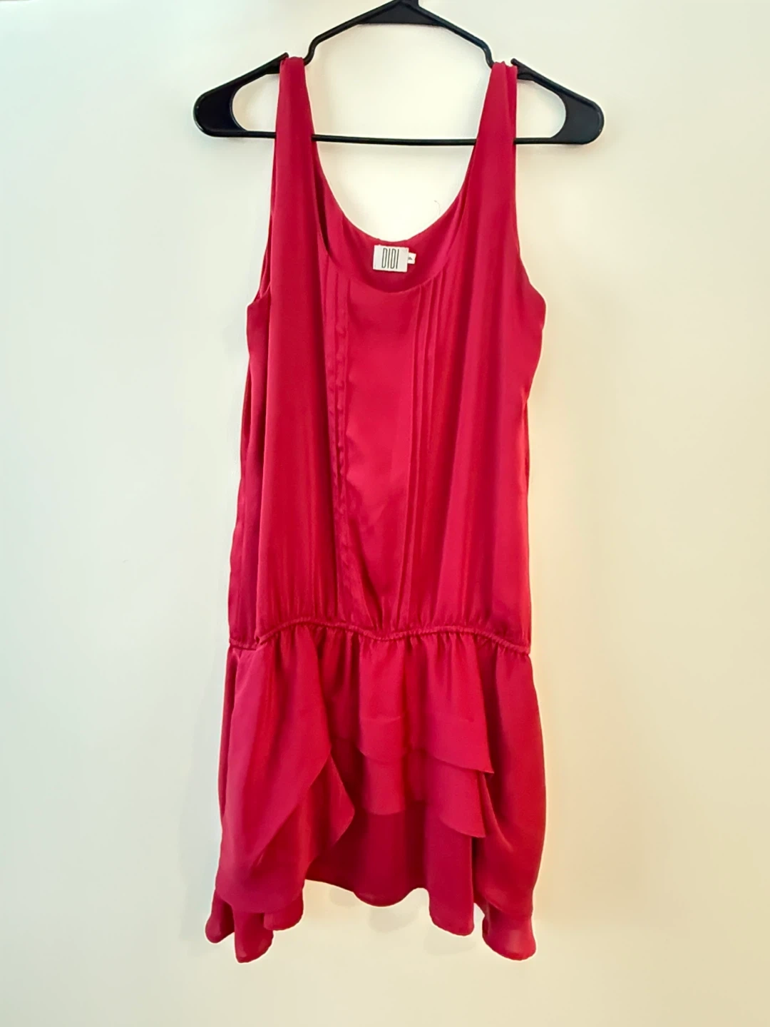 Here's a Brazilian dress in a vibrant cherry color! It's in great condition and ready for a new home. It features a unique design with pleats and a layered ruffle detail at the bottom. Perfect for a night out or a special occasion