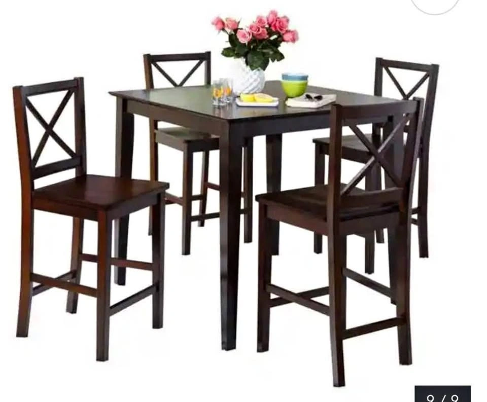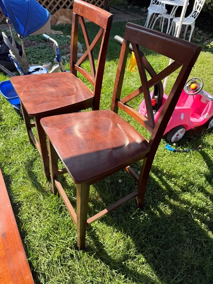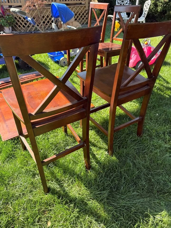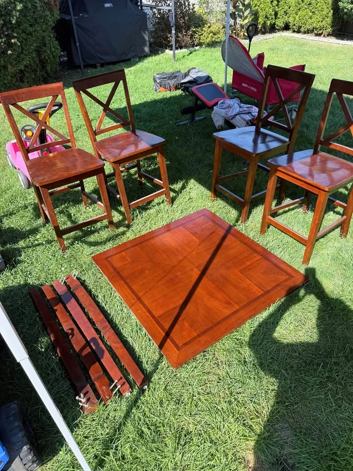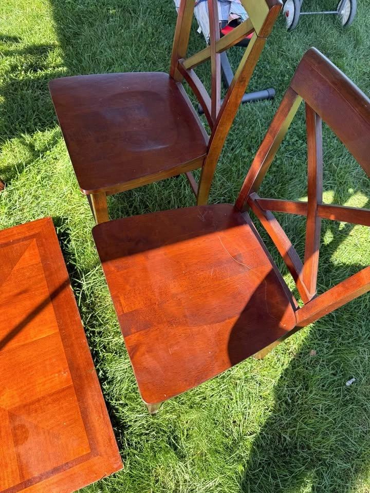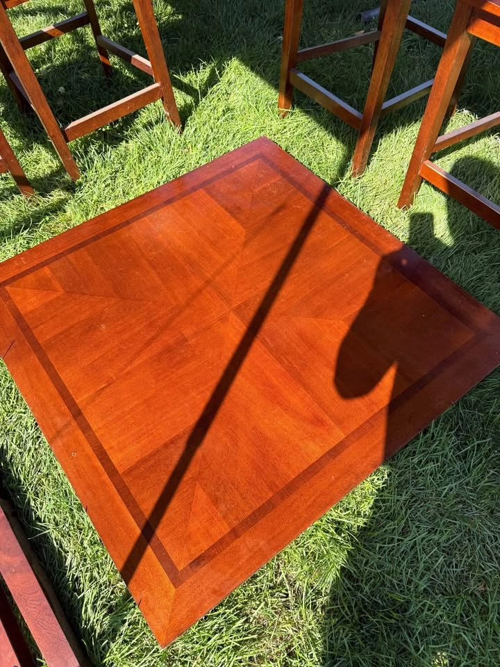 12Wooden brown breakfast square table with 4 chairs - normal wear, has been in storage. Height 3’ of the tablet. Width and depth 3’2” (square)