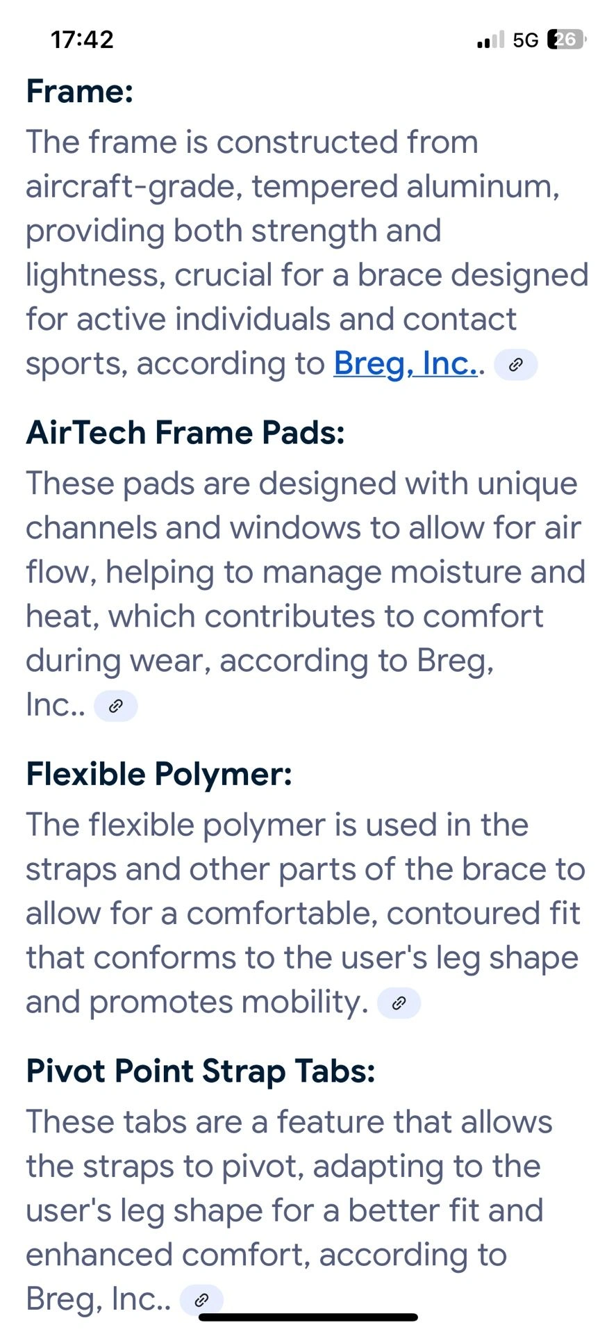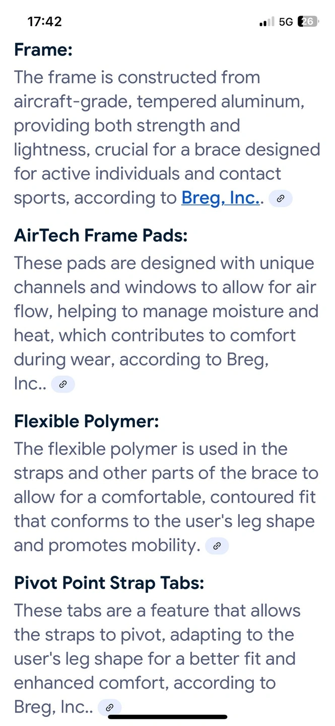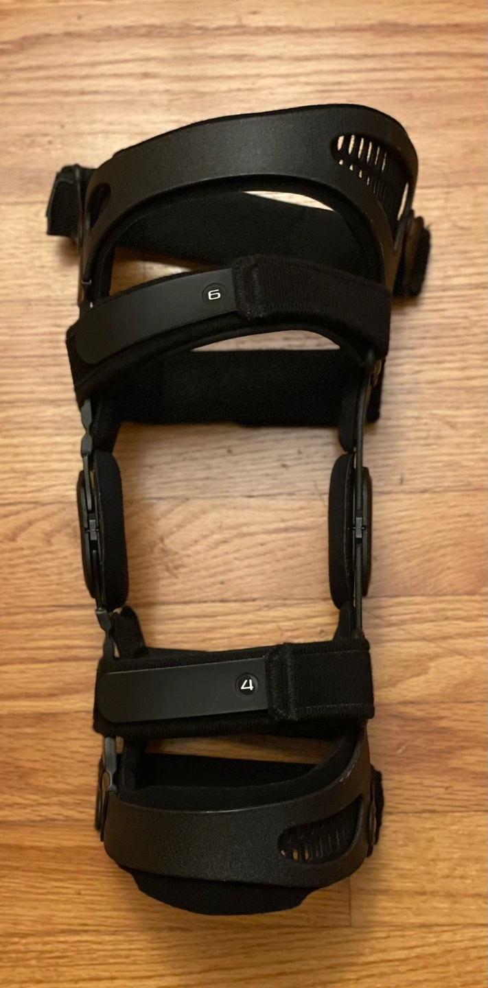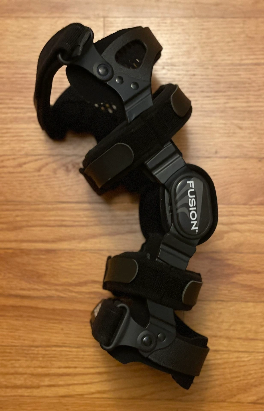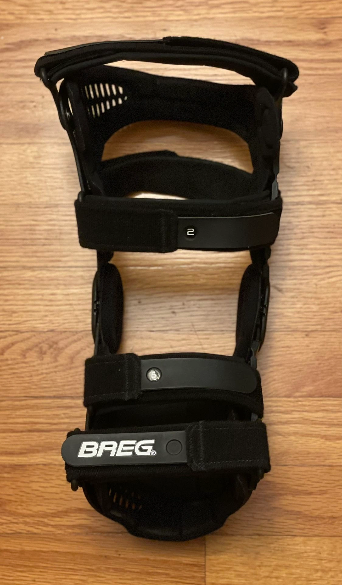 Brand: Breg Fusion Breg Fusion ACL Knee Brace, Right Leg, Black. In excellent (like new) condition, very gently used. You won’t find a nicer one at this price. Retails for $550.00 - $1,000.00. Frame: The frame is constructed from aircraft-grade, tempered aluminum, providing both strength and lightness, crucial for a brace designed for active individuals and contact sports, according to Breg, Inc.. AirTech Frame Pads: These pads are designed with unique channels and windows to allow for air flow, helping to manage moisture and heat, which contributes to comfort during wear, according to Breg, Inc.. Flexible Polymer: The flexible polymer is used in the straps and other parts of the brace to allow for a comfortable, contoured fit that conforms to the user's leg shape and promotes mobility. Pivot Point Strap Tabs: These tabs are a feature that allows the straps to pivot, adapting to the user's leg shape for a better fit and enhanced comfort, according to Breg, Inc..