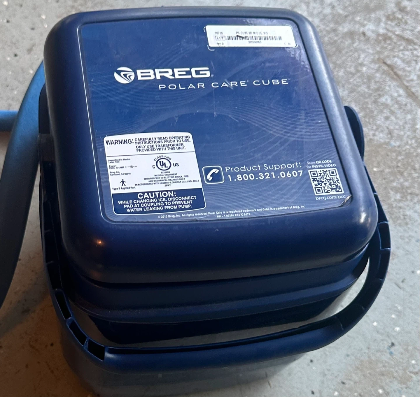 Selling a Breg Polar Care Cube. Please read the operating instructions prior to use. There is a warning to disconnect the pad at coupling to prevent water leaking from the pump while changing ice