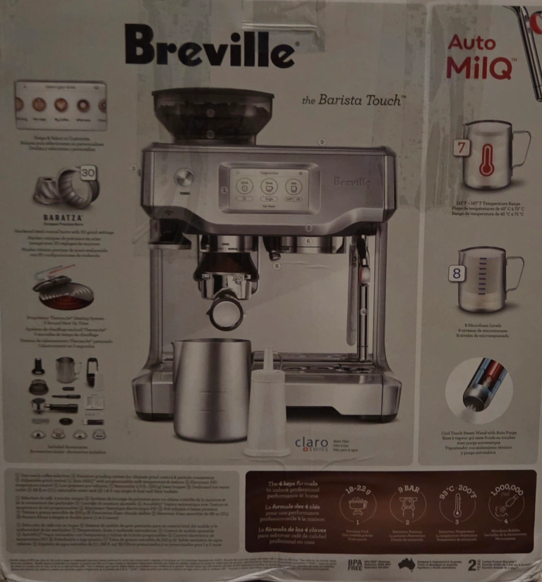Selling a Breville Barista Touch Espresso Machine. It comes with the box. The Barista Touch features: -Auto MilQ -Adjustable milk temperature range -9 Microfoam levels -Cool touch steam wand with auto purge -Integrated burr grinder with 30 grind settings -Precise espresso extraction