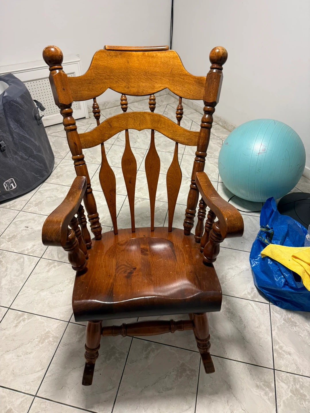 Selling a classic wooden rocking chair. It's in good condition and ready for a new home. Perfect for relaxing on the porch or in the living room!